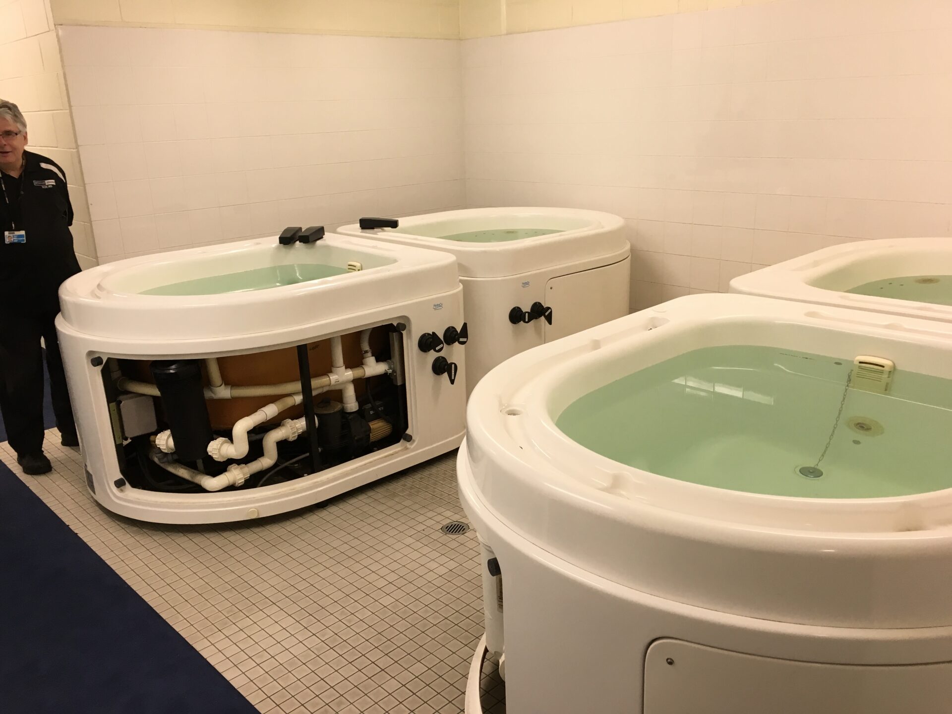 試合前に選手が着替えたり、ミーティングを行う控室はとても広かった。マッサージベッドやお風呂も多く準備されており、プレーヤー数が多いスポーツにも対応できる仕様となっていた。