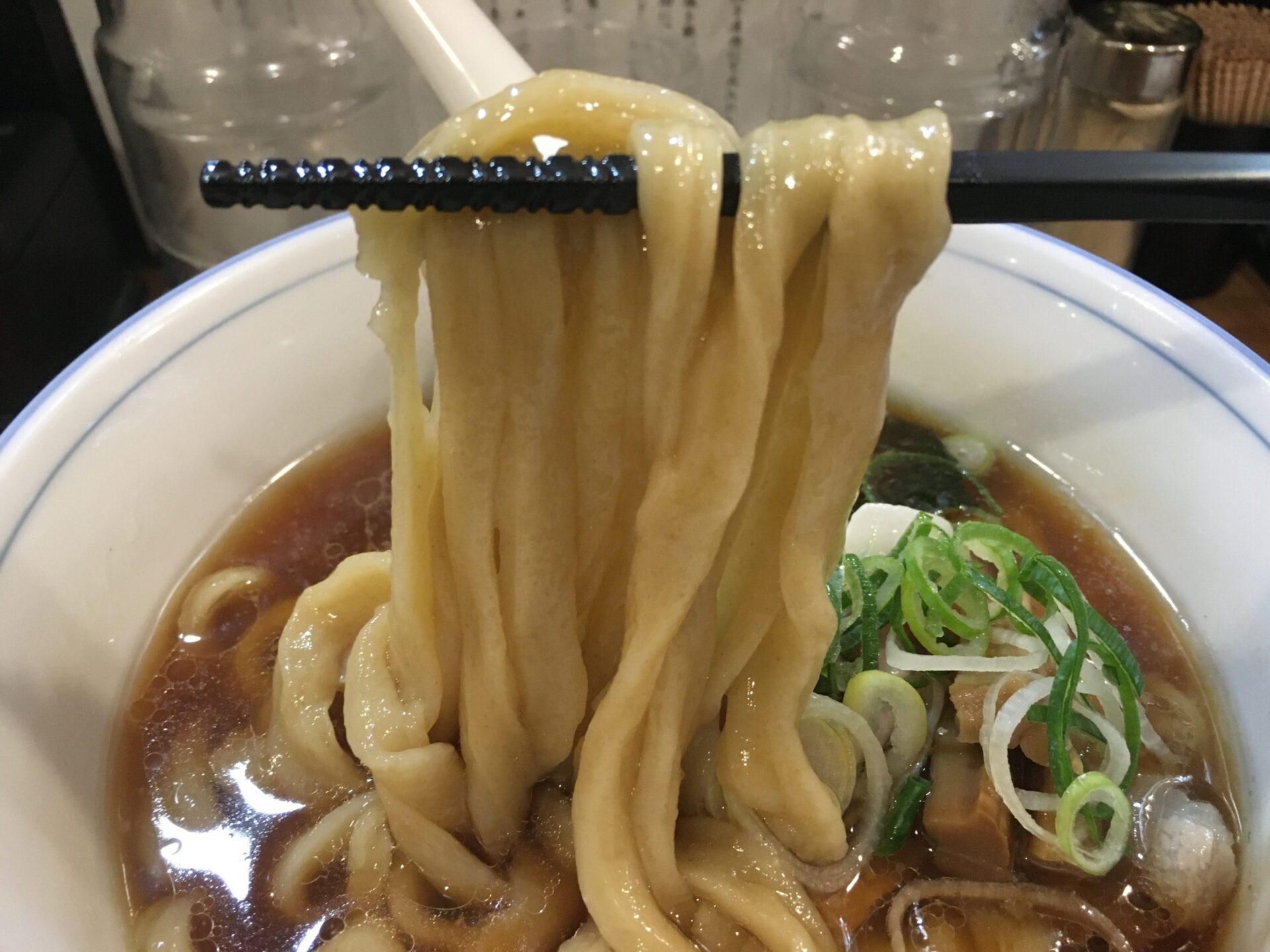 最大の特徴は何と言っても極太幅広麺。最近ラーメン界で流行り始めている“もち小麦”「もち姫」を用いた(少し「春よ恋」も使っているらしい)100%手打ち式の自家製麺で、水回しから切り出しまで手作業。刀削麺のような加水率高めなモチモチ食感をラーメンでも楽しめる。
