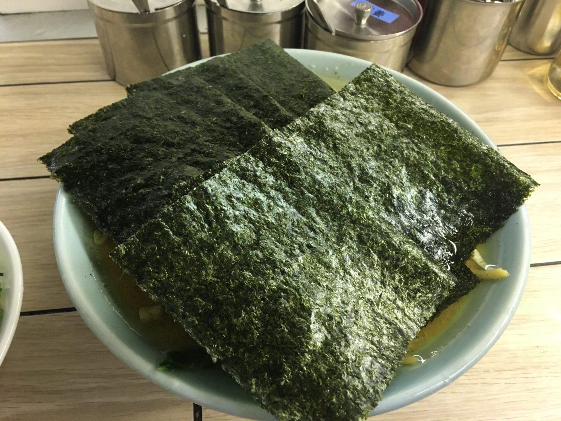 「らすた麺」はいわゆる特製。チャーシュー2枚、ほうれん草、味玉、ネギ、そして海苔がトッピングされているのだが……提供時の海苔の存在感に驚かされる。「油:多目」を注文すると豚骨醤油スープに浮かぶ鶏油の存在感に驚かされる。鶏油のおかげで最後まで熱々で食べられる。途中からは卓上調味料で味変も。無論、白米が進む。無料できゅうりのQちゃんをどうぞ。