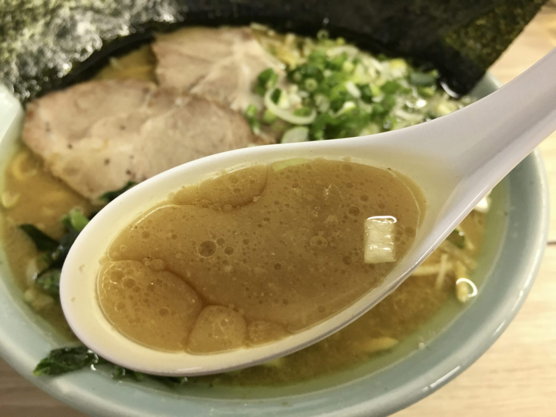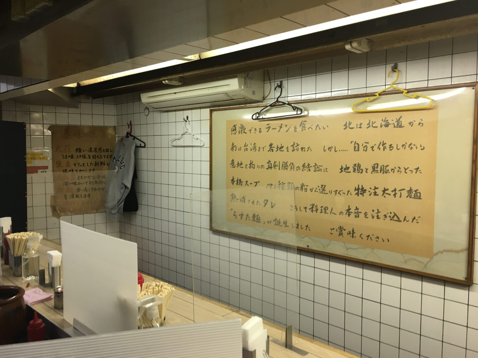 日吉に本店がある「極楽汁麺らすた」の支店。家系ラーメンながら「〇〇家」を名乗らない珍しい店名に代表されるように、吉村家、本牧家、六角家のいわゆる「家系御三家」の系譜からは外れている。店外で食券を購入してから店内へ。BGMはレゲエ。カウンターのみ10席の小さな店ながら、そこまで混雑している印象はない。メニューは「ラーメン」「つけ麺」「まぜそば」の3種類が基本。ラーメンは「味:濃い目・普通・薄味」「油:多目・普通・少な目」「麺:かため・普通・やわらかめ」から選べる。