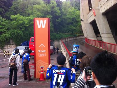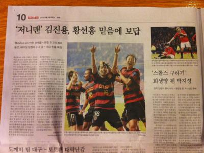 往路の飛行機は金森社長、復路の飛行機は選手達と同便で韓国より帰国。今回の遠征では車をチャーターして釜山から浦項のスタジアムまで移動したので疲労感は少ない旅になった。スタジアムの周辺はヤマハスタジアムの雰囲気に近く、人気がない工場(?)だらけの町は少し怖かった。キックオフ2時間前に到着。ガンバ大阪のスタッフさんから無料チケットを受け取って入場。試合開始まではスタジアム中で各サポーターが様々な場所を記念撮影して過ごすのがACLアウェイでの定番の光景。スタジアムグッズをお土産としたり、結構時間は潰せる。