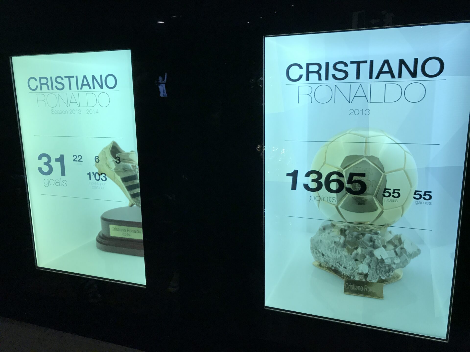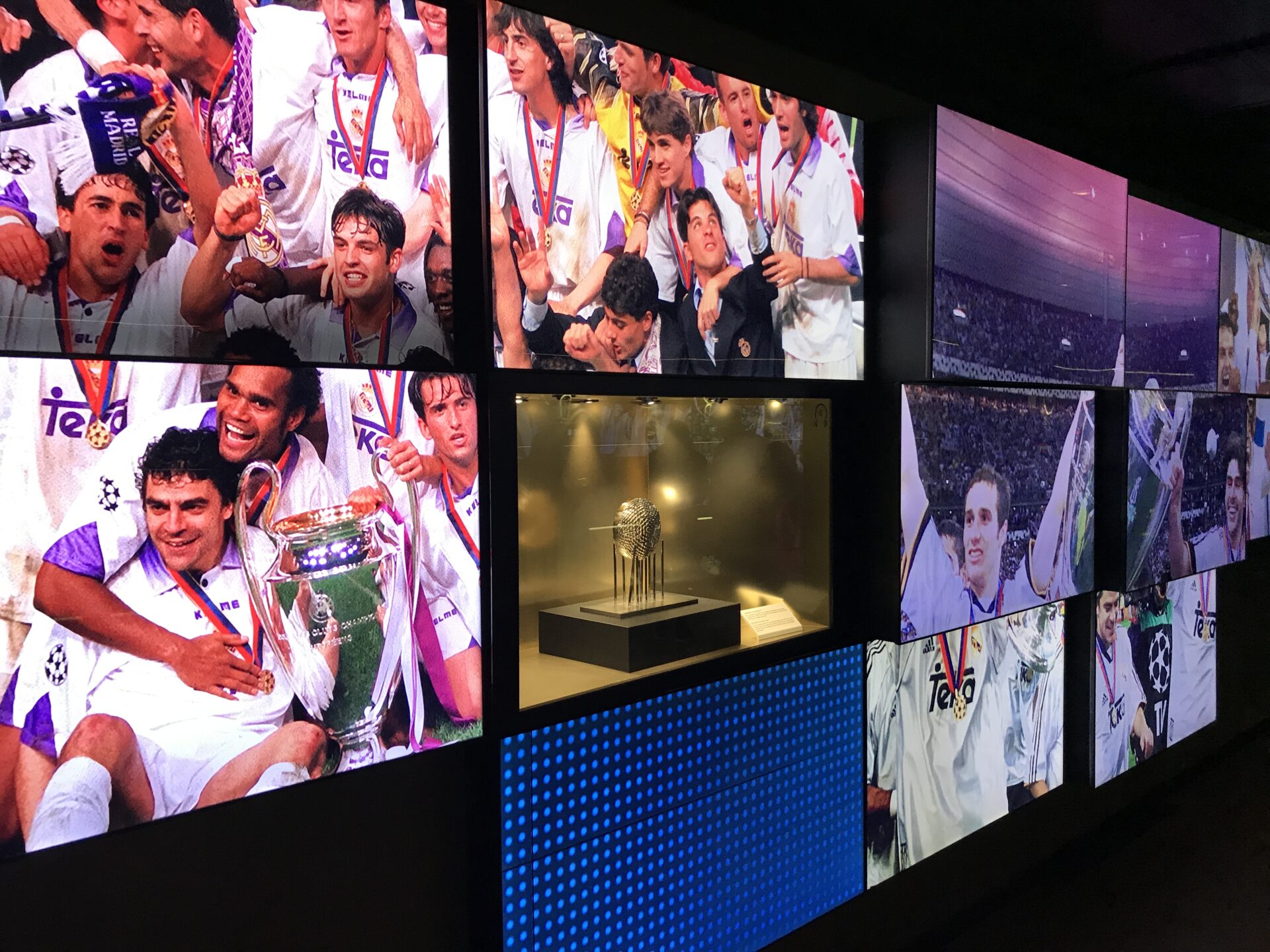 展示されているトロフィー量に圧倒される。チャンピオンズリーグやバロンドールのトロフィーを、あれだけの数見られるのはレアルマドリードならでは。全世界からお客さんが来る理由がここにある。施設内には映像アーカイブを視聴できるコーナーが充実しているのだが、使用されている試合映像はバルセロナを圧倒している試合が多く笑った。