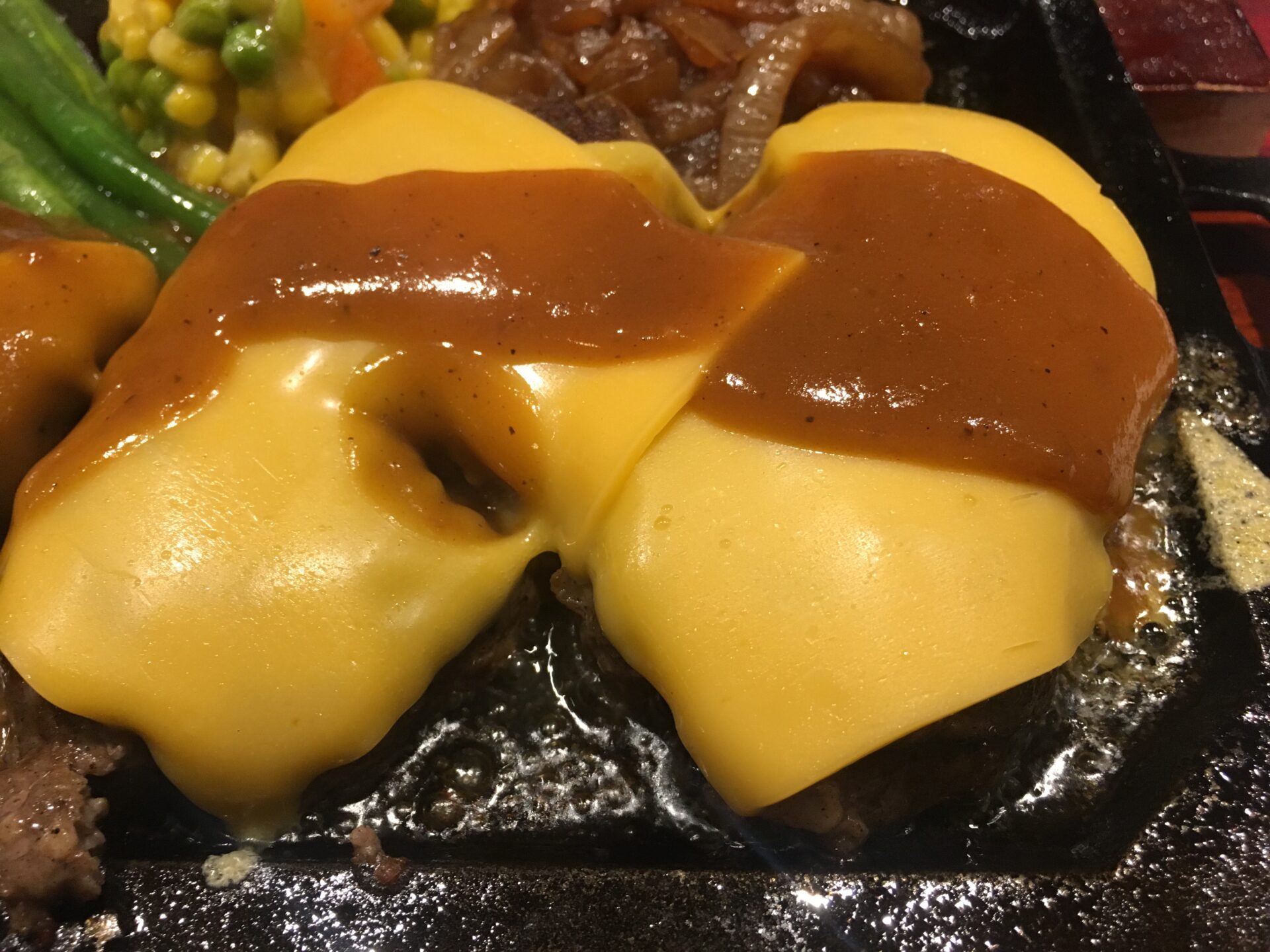 「粗く挽いた牛肉を、ごろんと丸めただけのハンバーグ」は肉々しくワイルドな味。「玉ねぎやパン粉などを混ぜない」「炭火はガスも電気も一切使用しない」……多くのこだわりが詰まっている。ハンバーグはプレーンの状態で席に運ばれ、目の前でカッティング等、最後の仕上げが行われる。その際に肉汁とソースが熱々の鉄板で跳ねまくるので注意が必要。今回はチーズのトッピング(170円)もお願いした。