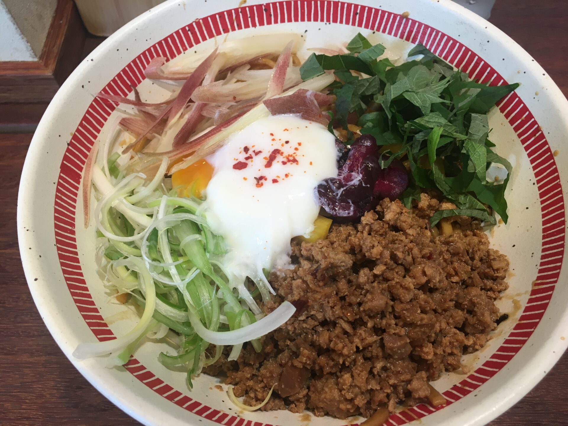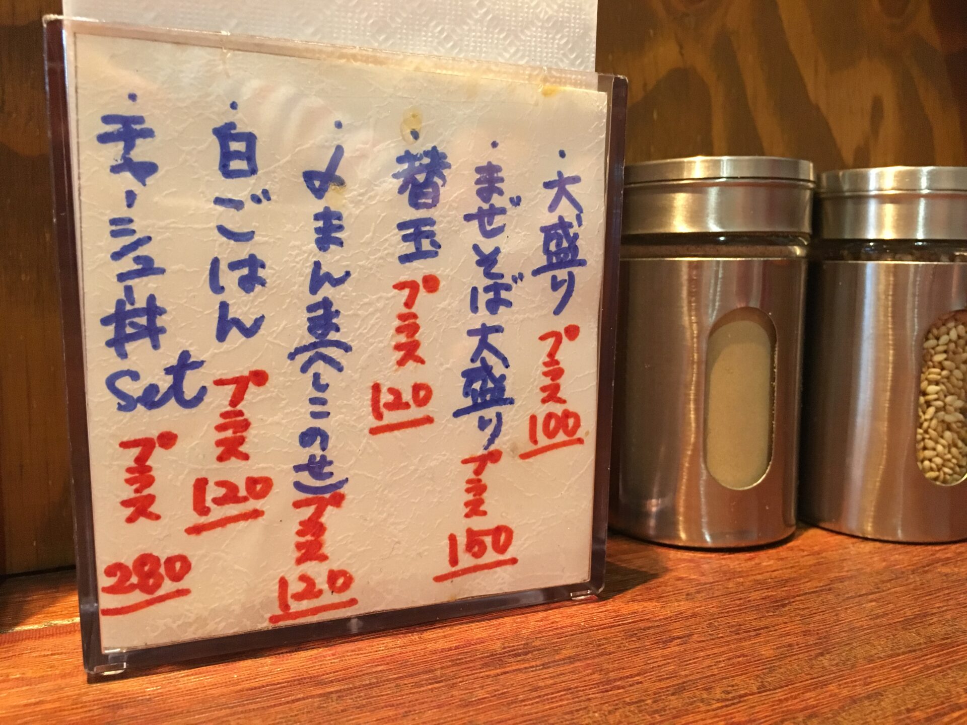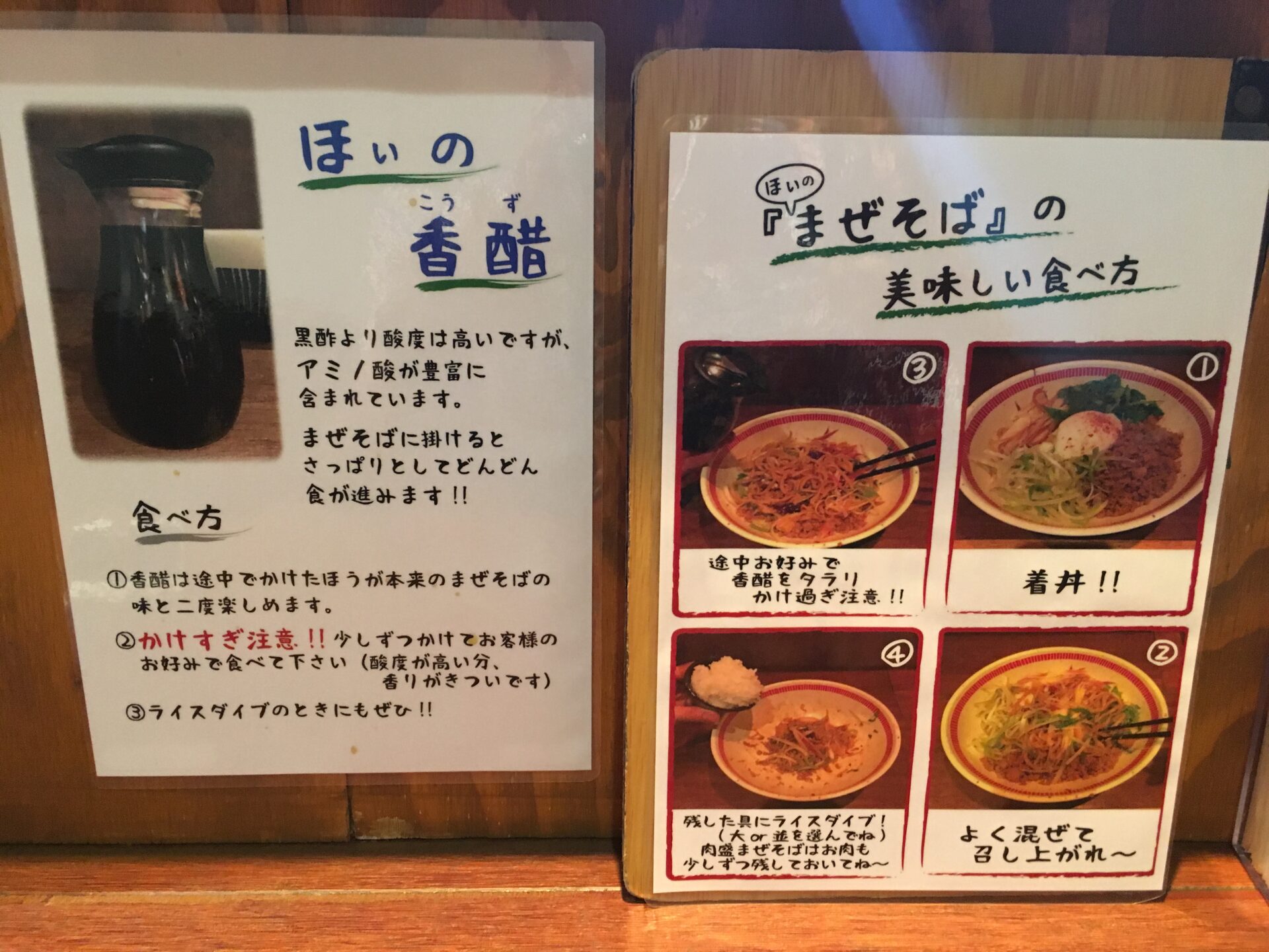 ちなみに、「まぜそば」メニューも種類が豊富。「ほぃのまぜそば(ライスダイブ付き)」(800円)は肉そぼろ、大葉、みょうが、白ネギ、しば漬け、たくあん、半熟たまごのトッピング。食感が面白く、半熟たまごのパワーでよりマイルド。2018年からは新メニューの「四川風旨辛マーラーまぜそば」(850円)も登場。山椒が効いた痺れる辛さで食べた後は汗だく必至。麻辣好きの方は是非。