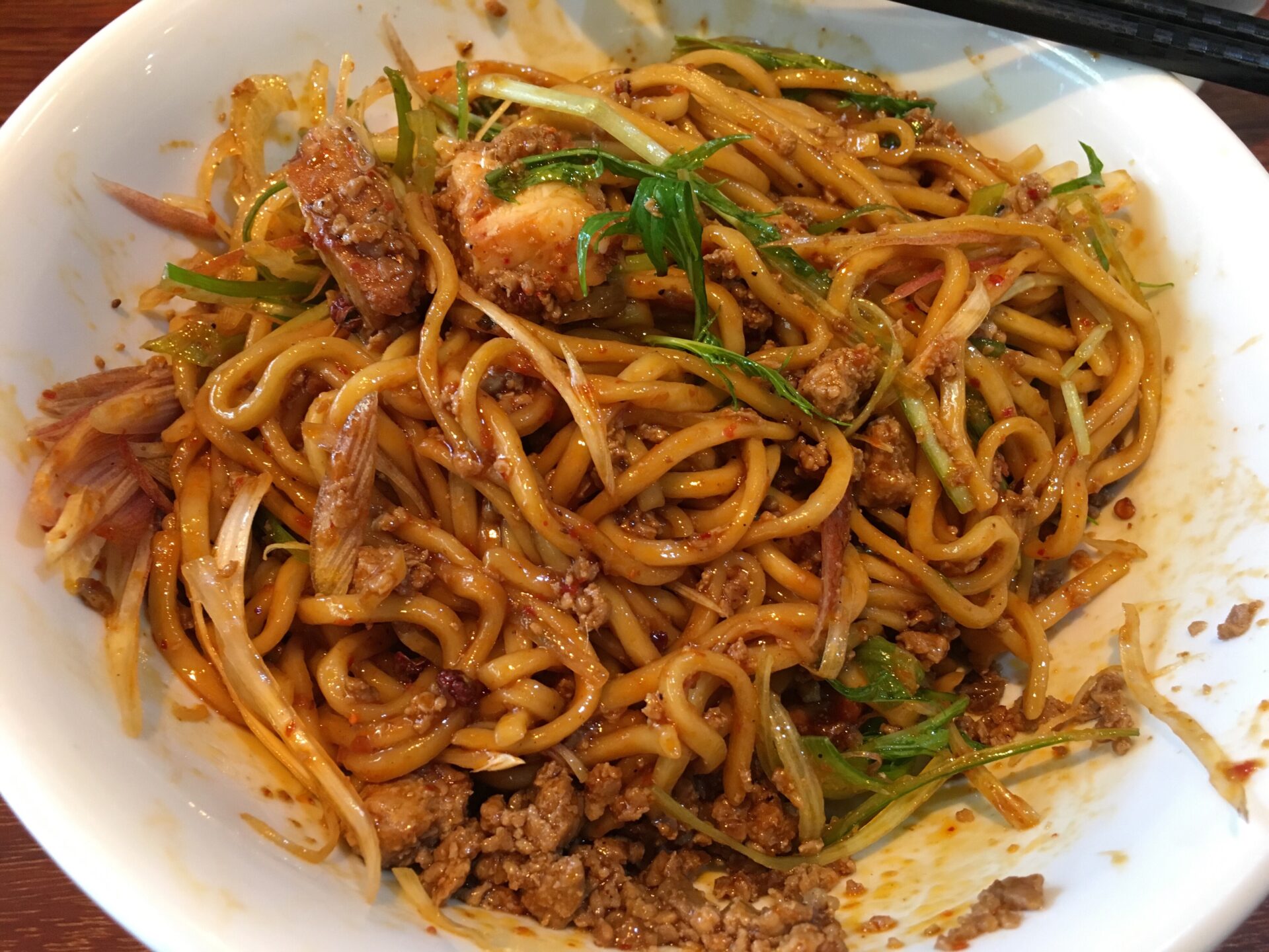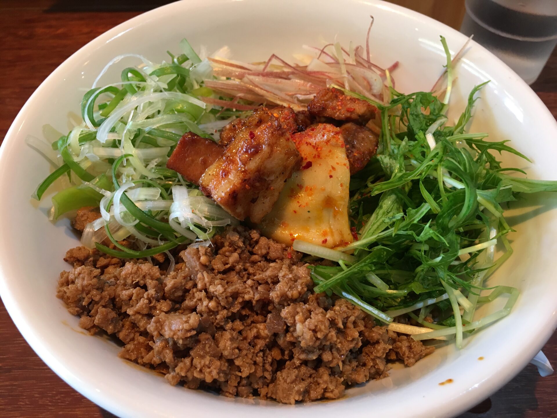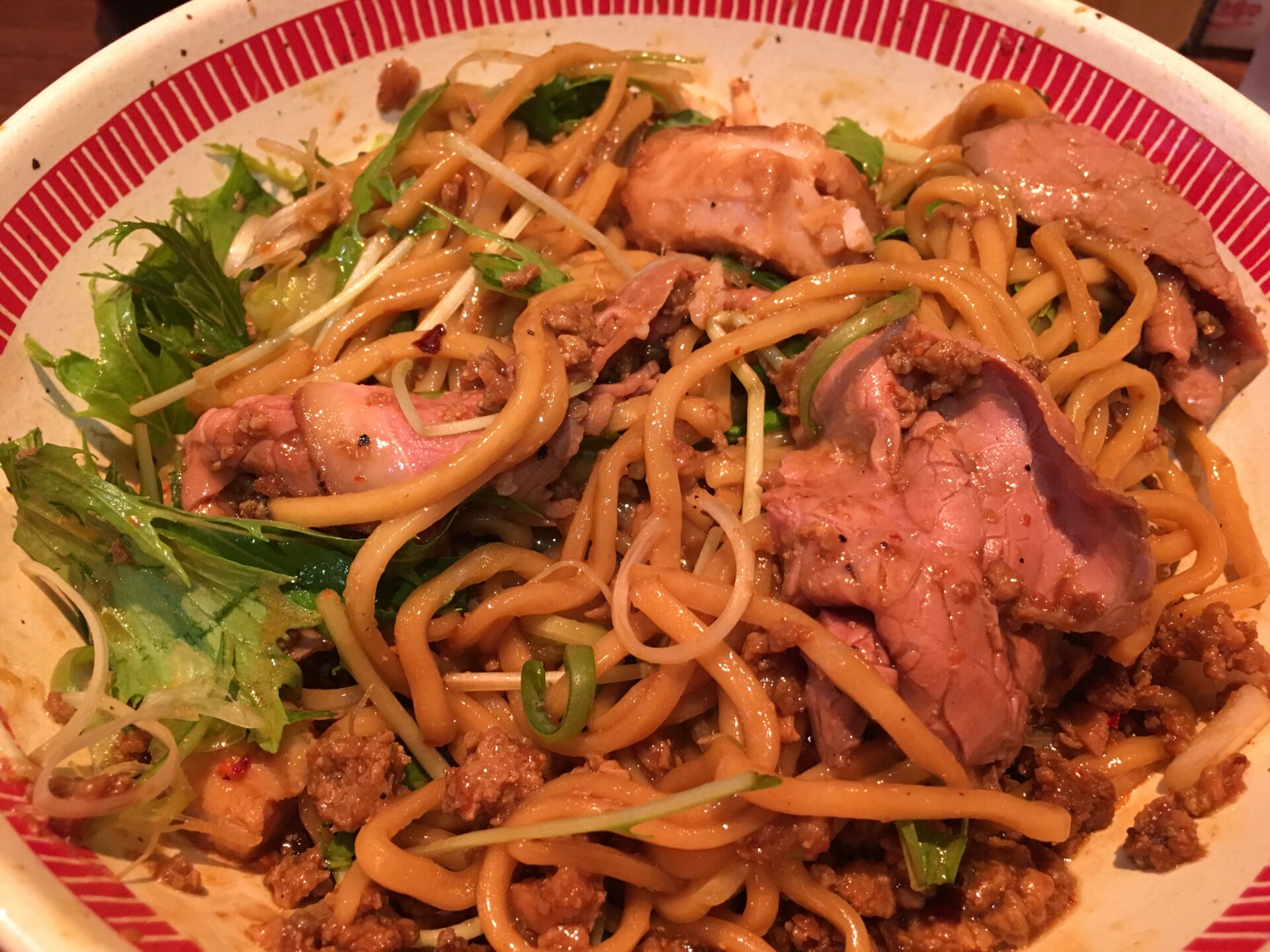 人気No.1メニュー。ラーメン(まぜそば)なのか、肉料理なのか分からないビジュアル。ローストビーフ、豚チャーチュー、肉そぼろ、水菜、白ネギ、たまねぎと具材が盛りだくさん。混ぜても肉の圧倒的存在感は変わらない。肉だけ食べても、麺と一緒に食べても美味しい。学生をターゲットにしているお店らしく、麺量は5段階調整が可能。最大ボリュームでもペロリな味。夏バテ防止メニューとしてもどうぞ。途中からにんにく酢や香醋を入れて味変も楽しめる。最後は白米をダイブさせて混ぜて〆。満足度100点満点のメニュー。