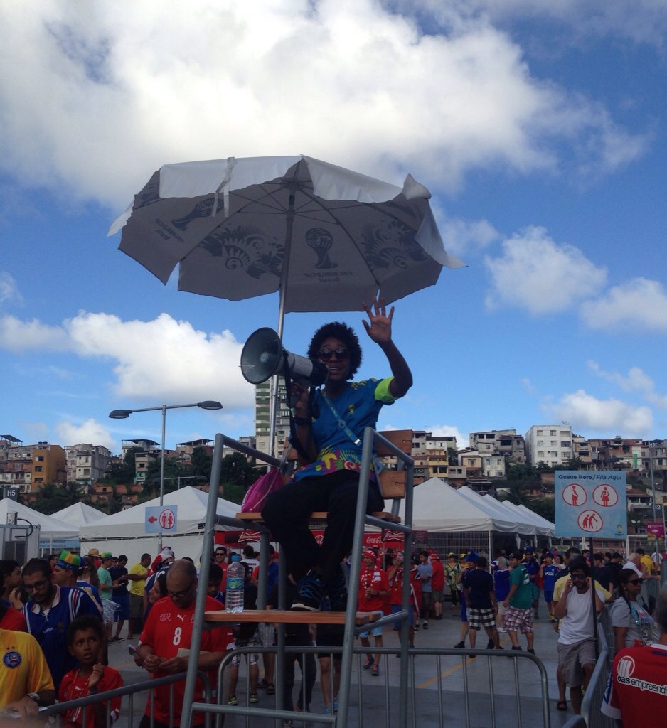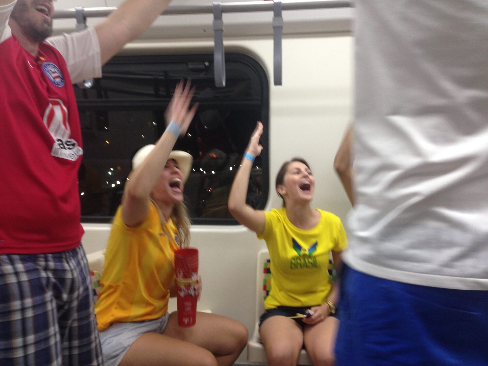 歌われる曲はブラジル代表を応援するチャントが多かった。車内のどこからともなくチャントが歌われ始めると、10秒後には車内全体での大合唱に変わる。私は日本国旗を手に街を歩くことが多かったのだが、それを見たブラジル人が「ジャーポン♪ジャーポン♪」と即興チャントを歌ってくれたことも数回あった。彼らは私の肩に手をまわし「さあ!お前も一緒に歌うんだ」と言わんばかりに飛びはねる。郷に入れば郷に従え。同乗していた日本人サポーター苦笑いを気にしつつも歌い、飛び跳ねた。ゴール裏での経験がこんなところで活きるとは。