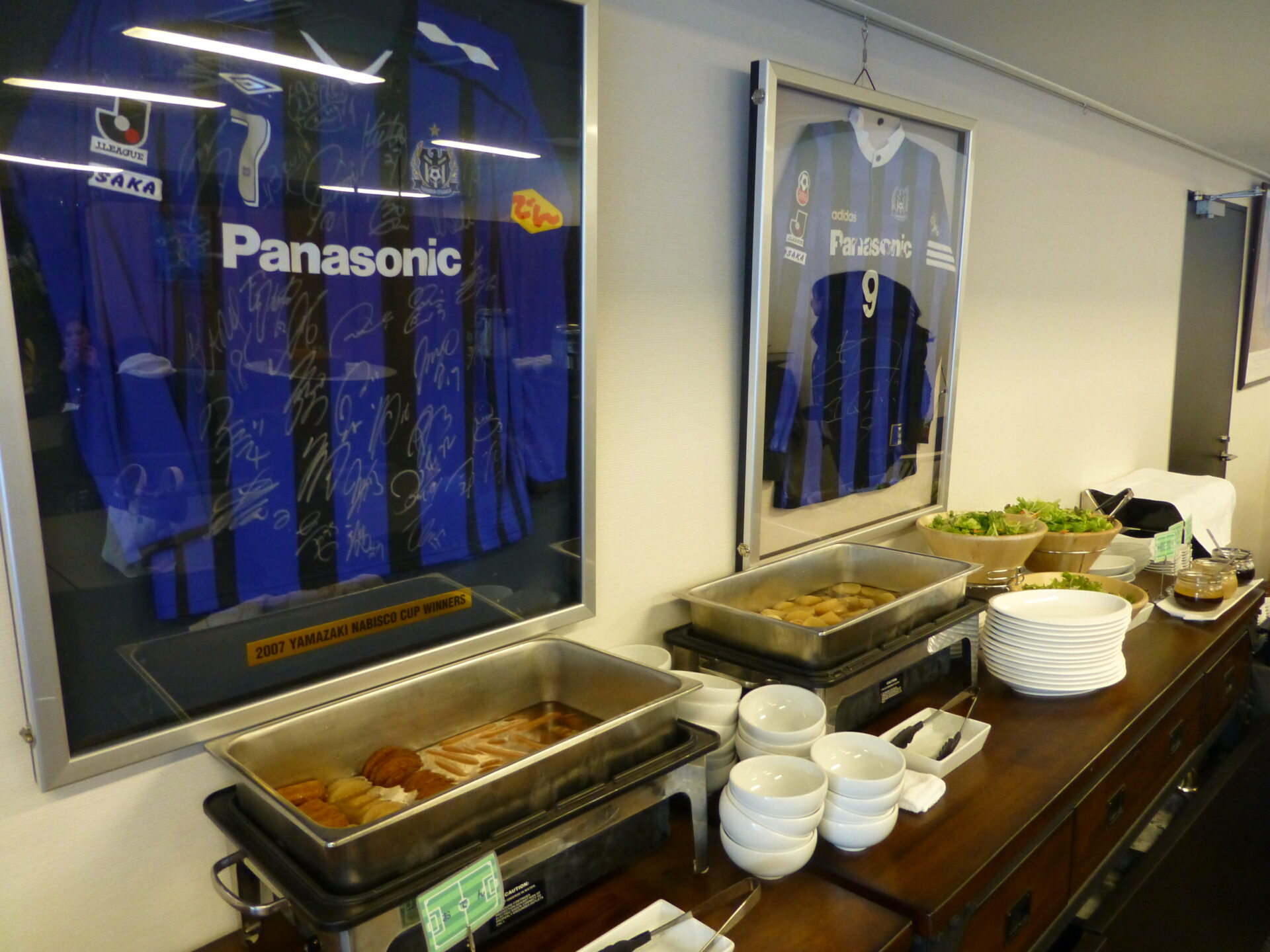 部屋に展示されているユニホームやグッズは、なんとガンバ大阪・社員さんの私物。手作り感を感じる装飾が楽しい気分にさせてくれる。この部屋は披露宴会場としても使われてることもあるそうで、サポーター同士で結婚する夫婦にとっては、パナスタは有力な選択肢の1つになりそう。