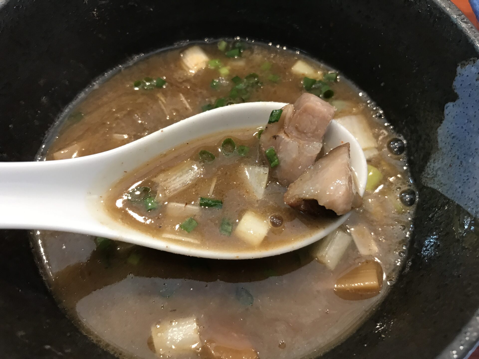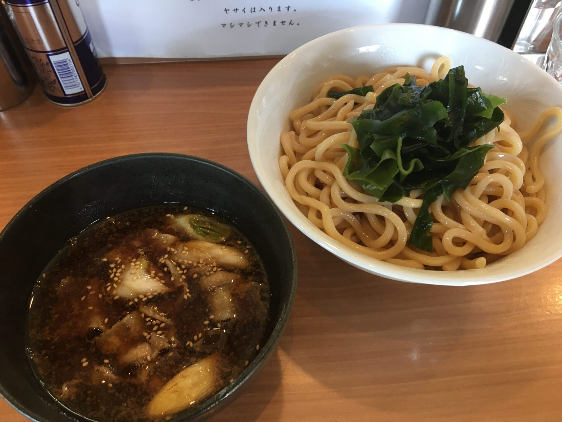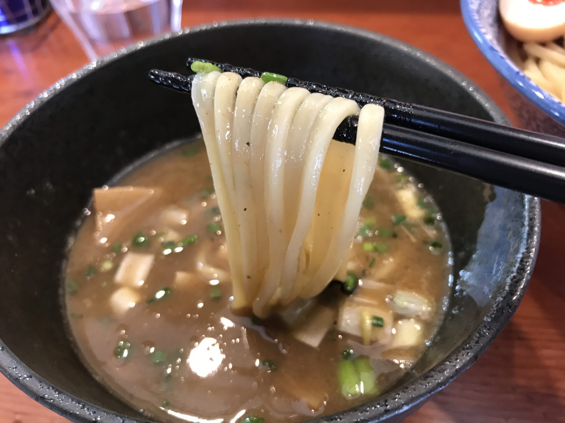 バランスが完璧な逸品。「麺がスープによく絡む」という表現をよく聞くが、そのレベルを越えて「麺とスープが一体化」といった口当たり。麺とスープがお互いに良いところを引き出しあっているような味。チャーシューはつけ汁に軽く漬けることで旨味が増す。つけ汁は豚骨魚介。「魚介風味」と「ゆず風味」から選択する。麺の大盛注文でつけ汁は1回おかわりが可能。