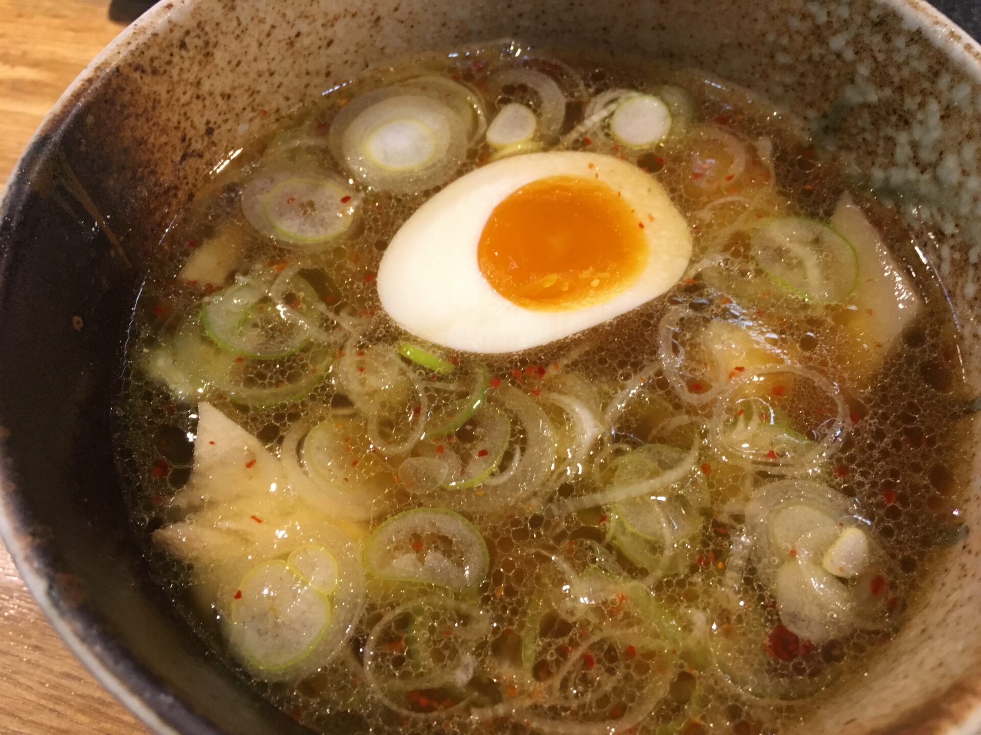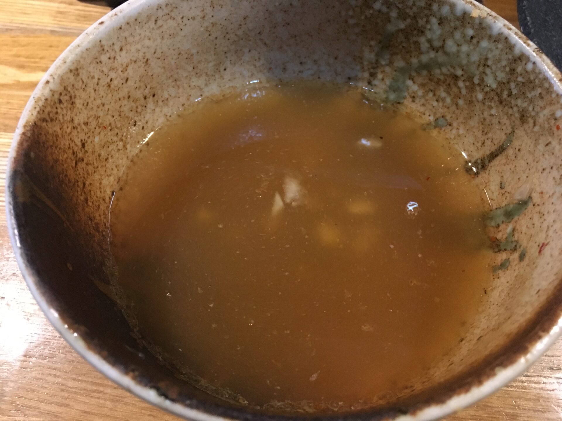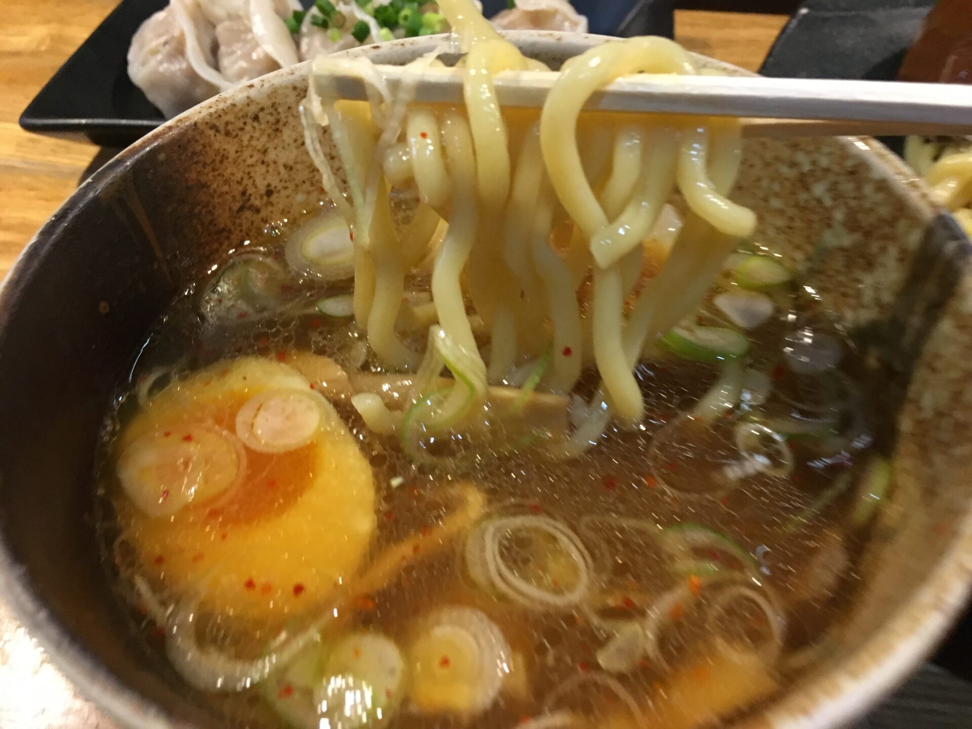 甘さの中にピリ辛を感じるスープが特徴。とろみは少なめ。人気チェーン店「つけ麺屋 やすべえ」のつけ汁に似ていると言えばイメージできる人も増えるか。味変は無料の刻み玉ねぎと削り節。麺はモチモチの極太麺。喉ごしが良いモチつる食感の割にはスープとよく絡む。