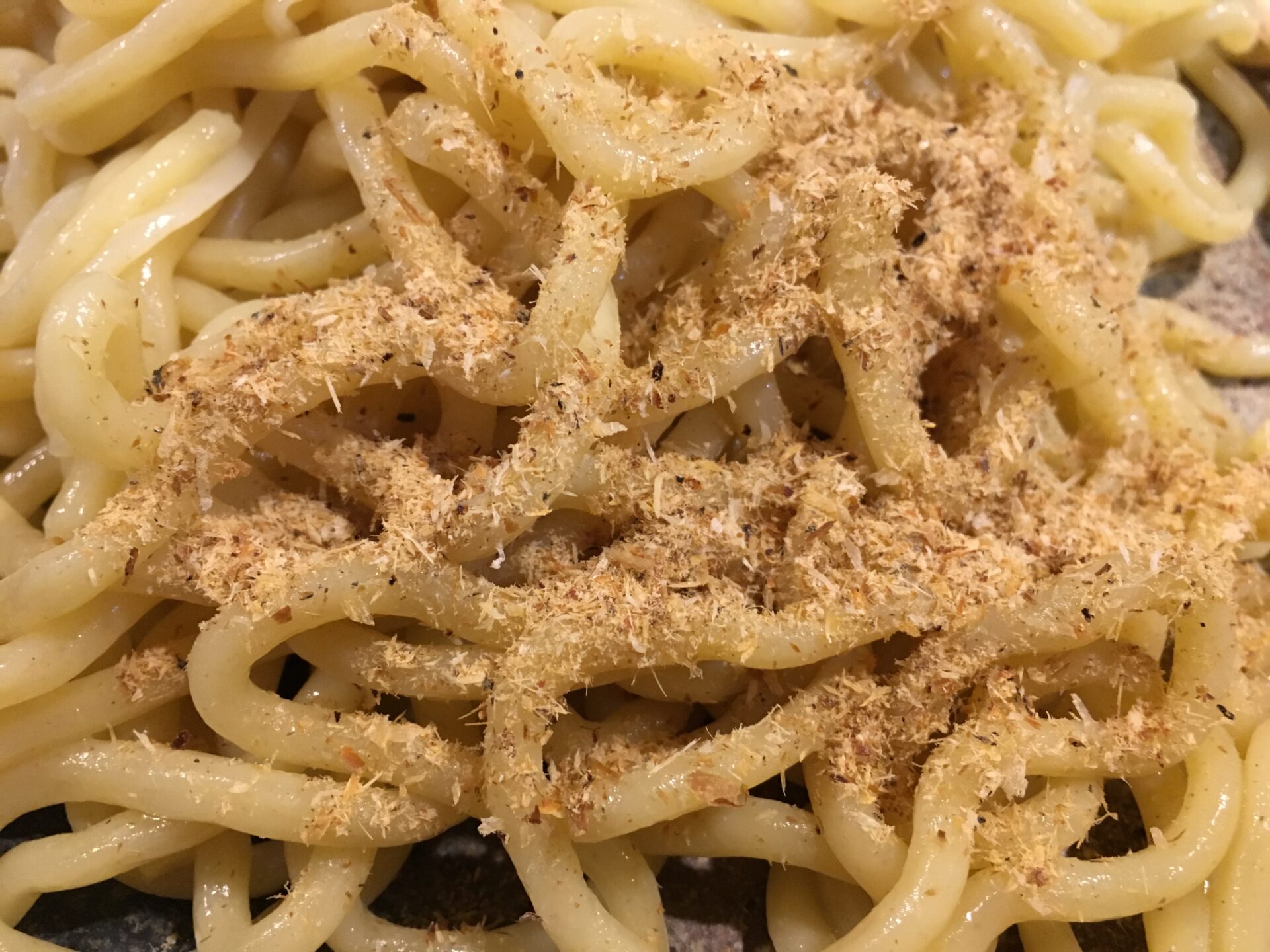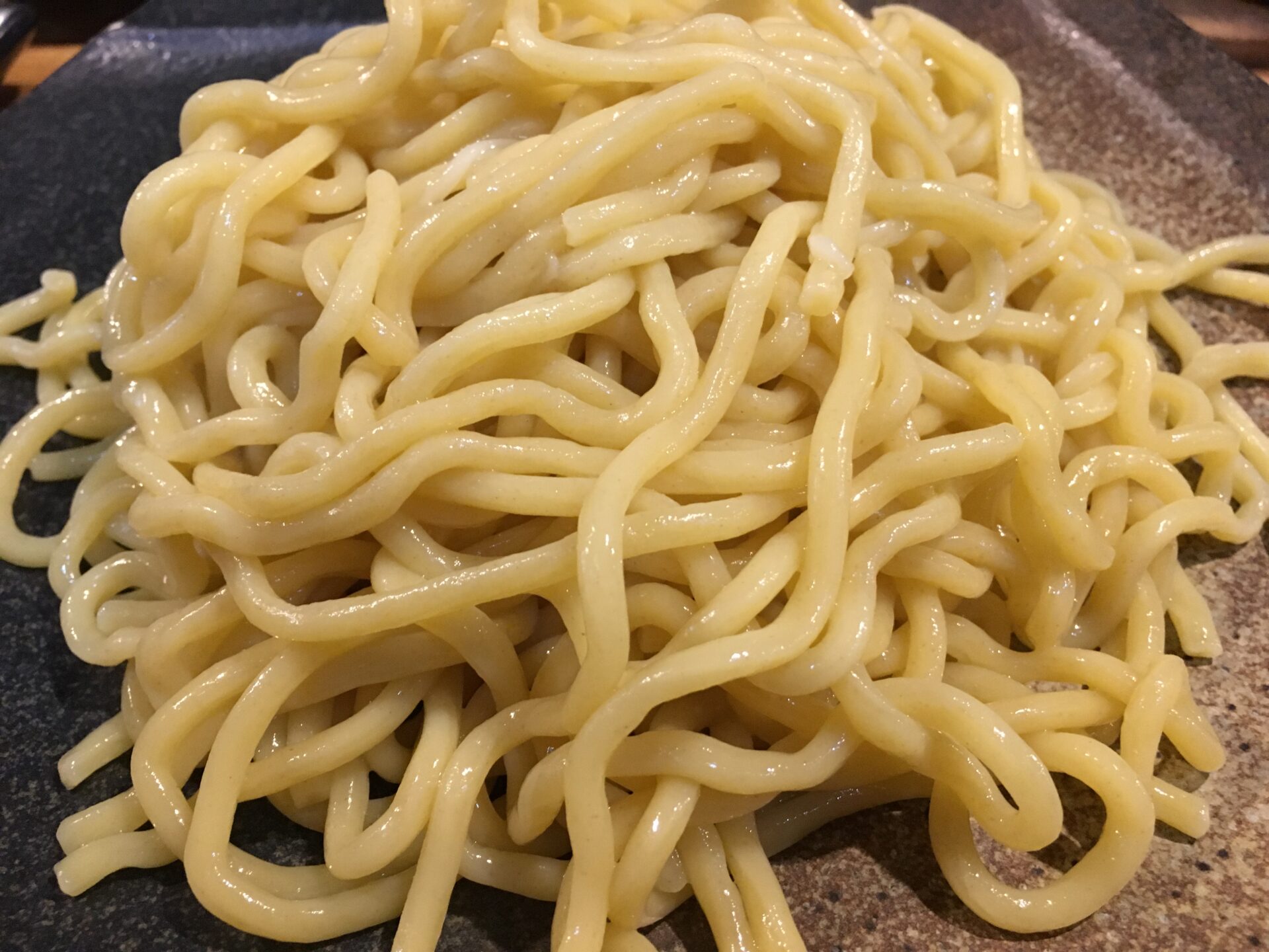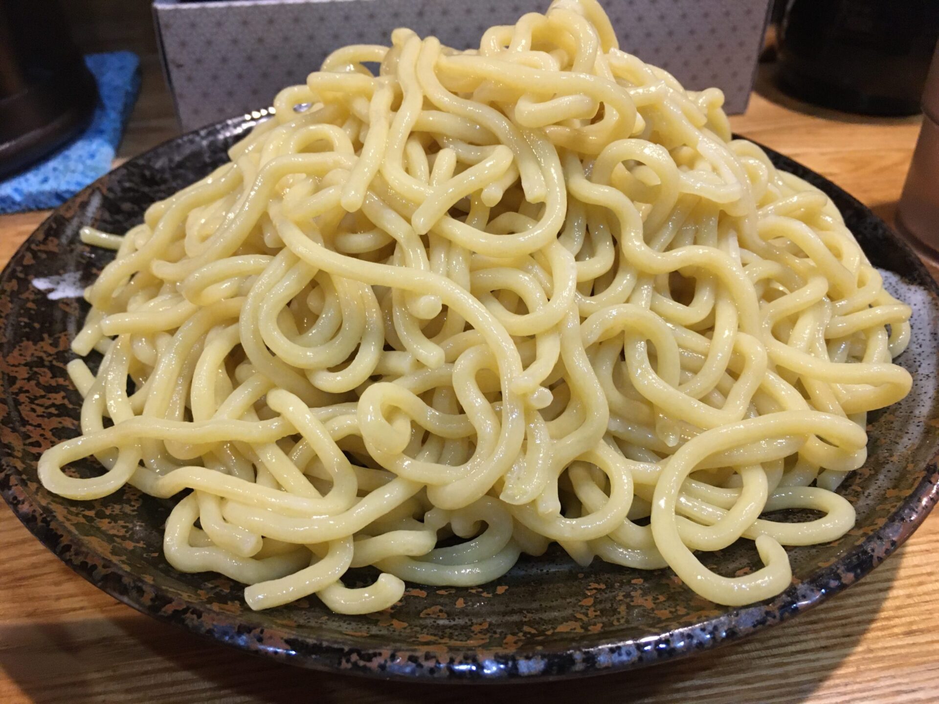 甘さの中にピリ辛を感じるスープが特徴。とろみは少なめ。人気チェーン店「つけ麺屋 やすべえ」のつけ汁に似ていると言えばイメージできる人も増えるか。味変は無料の刻み玉ねぎと削り節。麺はモチモチの極太麺。喉ごしが良いモチつる食感の割にはスープとよく絡む。