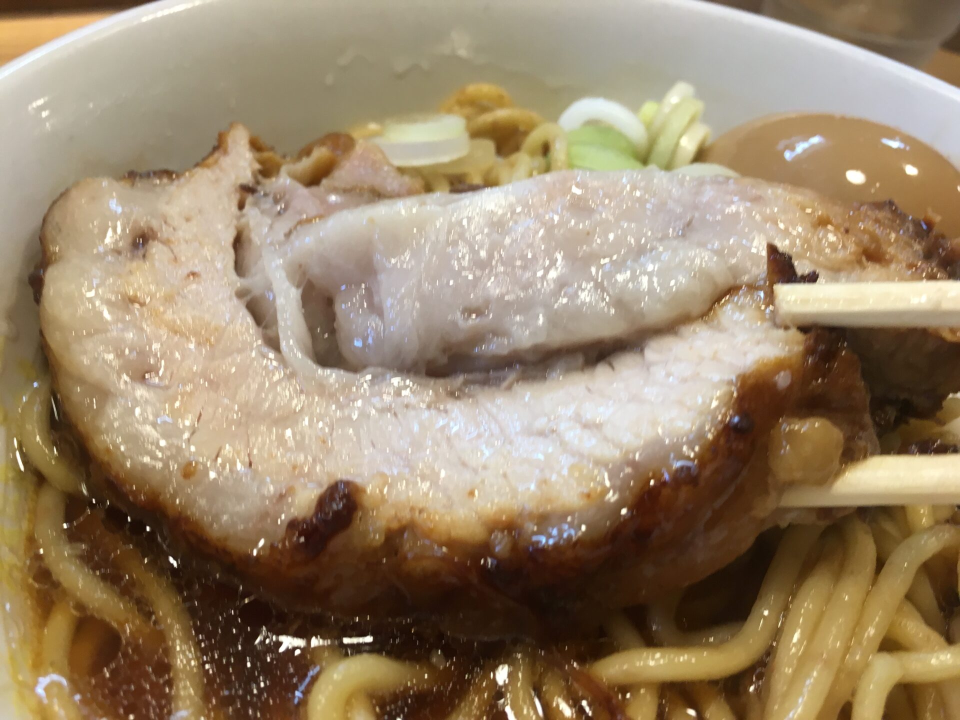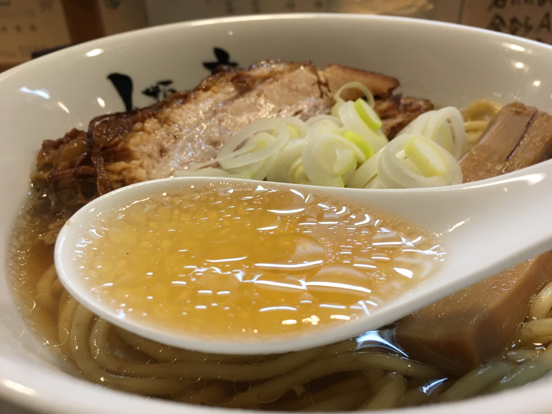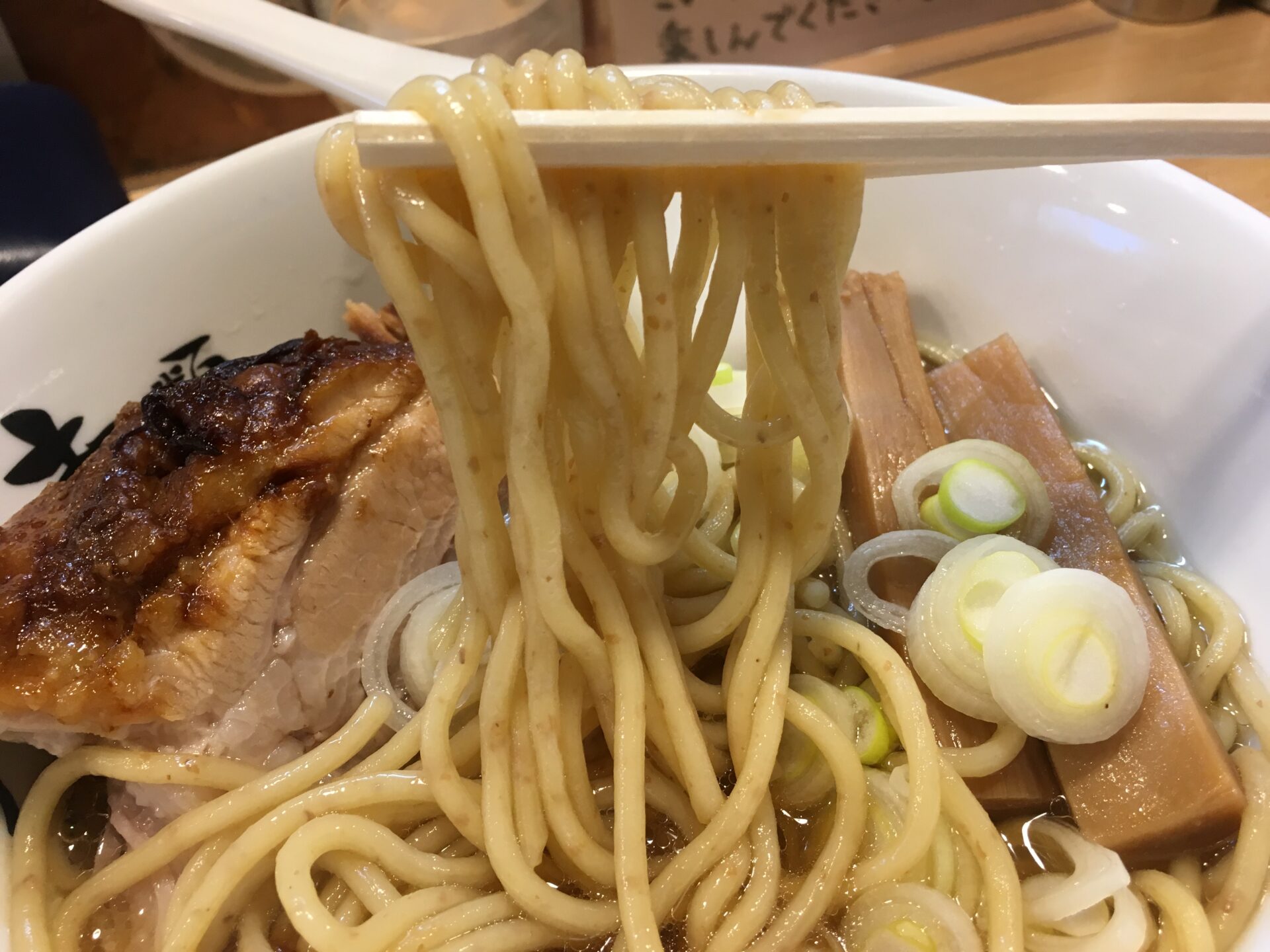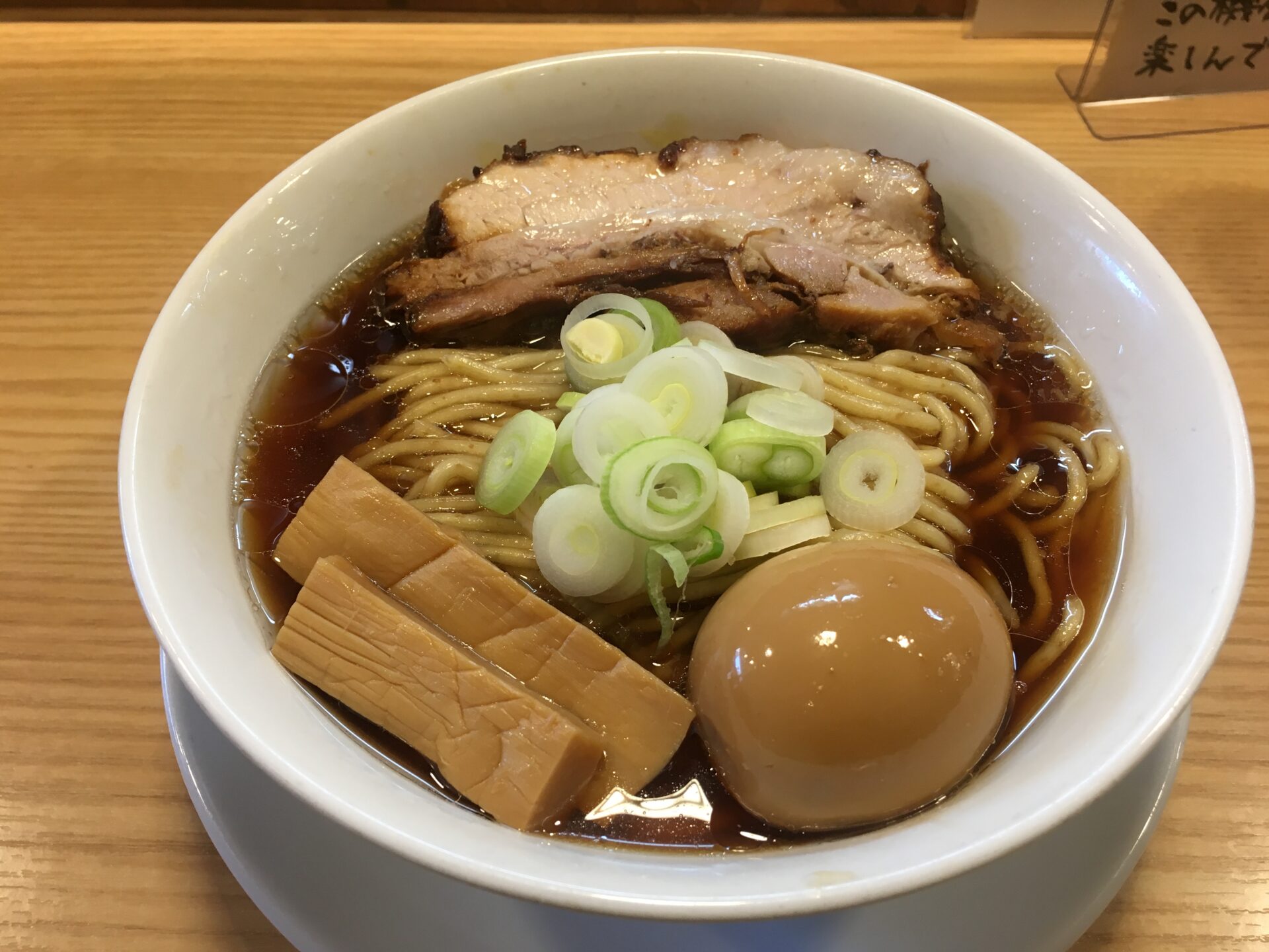人気ナンバーワンメニュー。薄口醤油と貝の旨味が融合したスープは万人受けする味。口当たりがとても良い。初来店時にはこれを注文したい。澄んだスープの上に鎮座するのは角煮のような極厚チャーシュー。箸で切れるほどの柔らかさでジューシー。これを目当てに訪問する人も多いのだとか。麺は中太の全粒粉麺で少し固め。素人舌でもスープ、麺、トッピングが足し算ではなく完璧なバランスで一体化のが分かる。完成度が極端に高いラーメン。