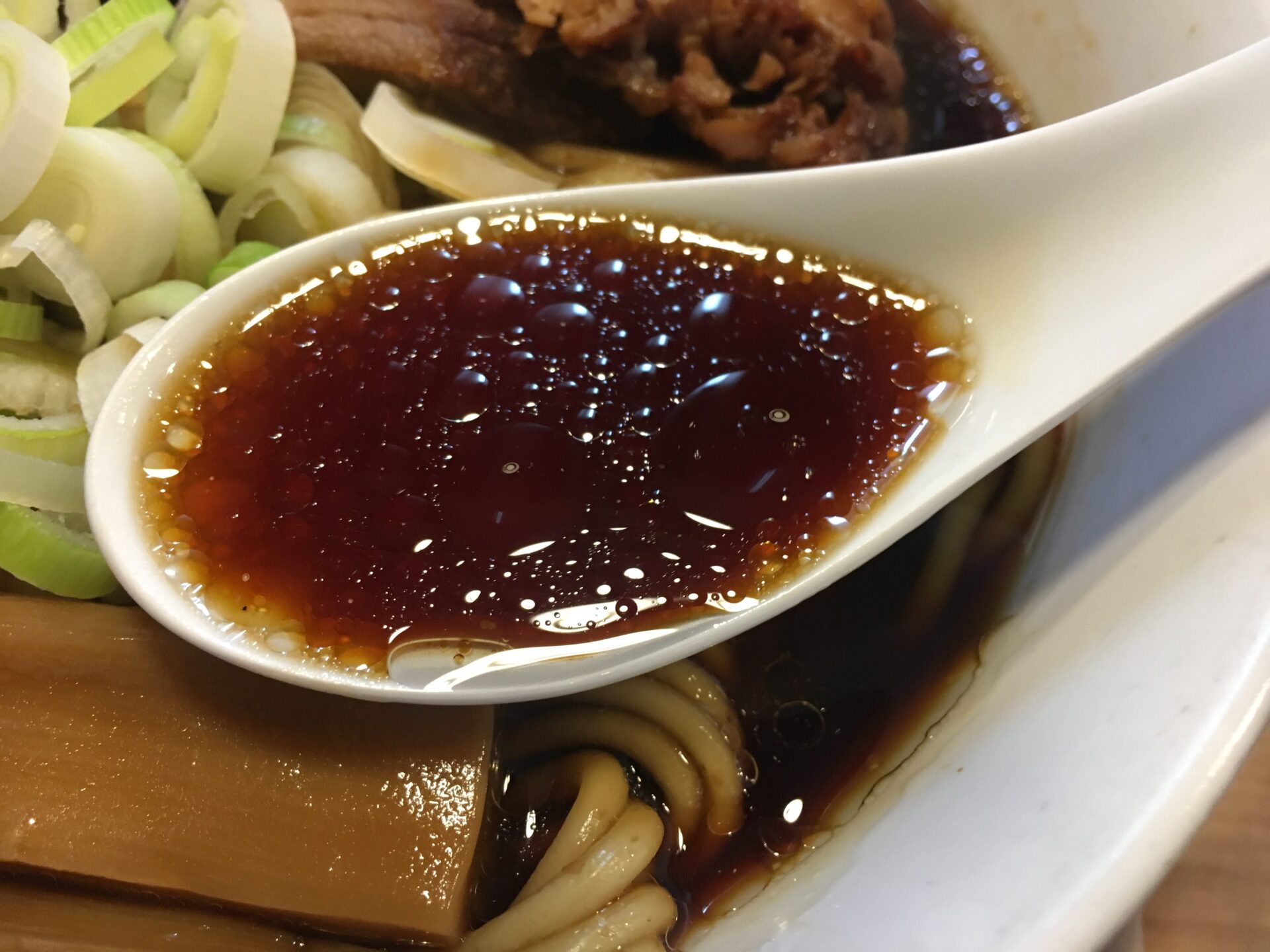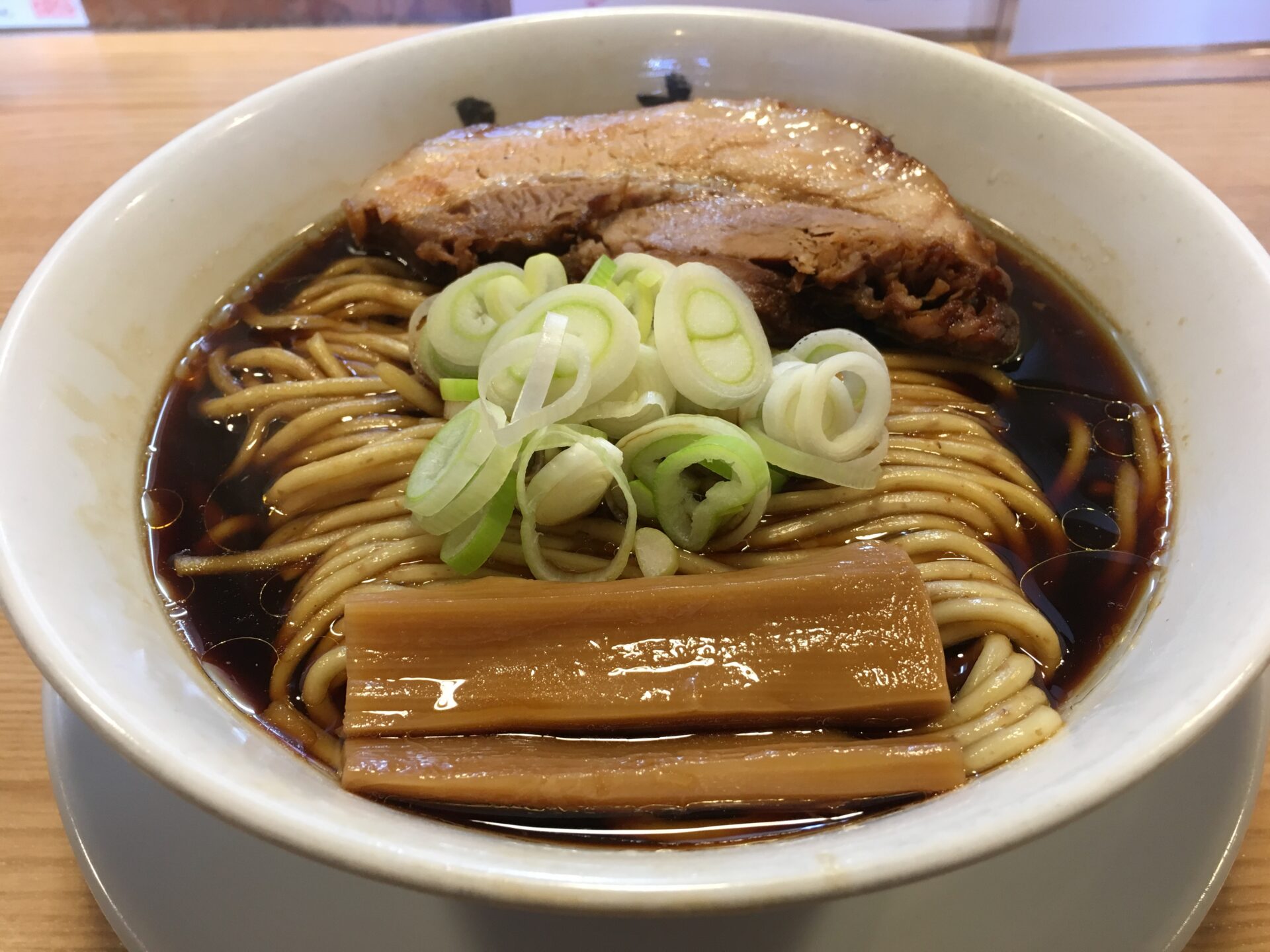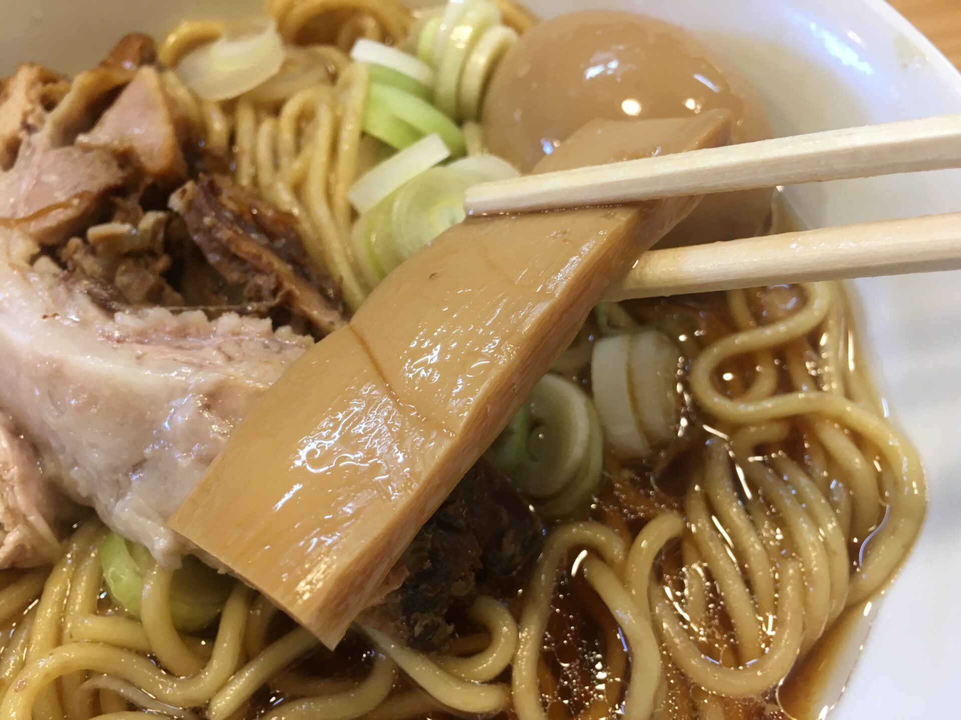 人気ナンバーワンメニュー。薄口醤油と貝の旨味が融合したスープは万人受けする味。口当たりがとても良い。初来店時にはこれを注文したい。澄んだスープの上に鎮座するのは角煮のような極厚チャーシュー。箸で切れるほどの柔らかさでジューシー。これを目当てに訪問する人も多いのだとか。麺は中太の全粒粉麺で少し固め。素人舌でもスープ、麺、トッピングが足し算ではなく完璧なバランスで一体化のが分かる。完成度が極端に高いラーメン。