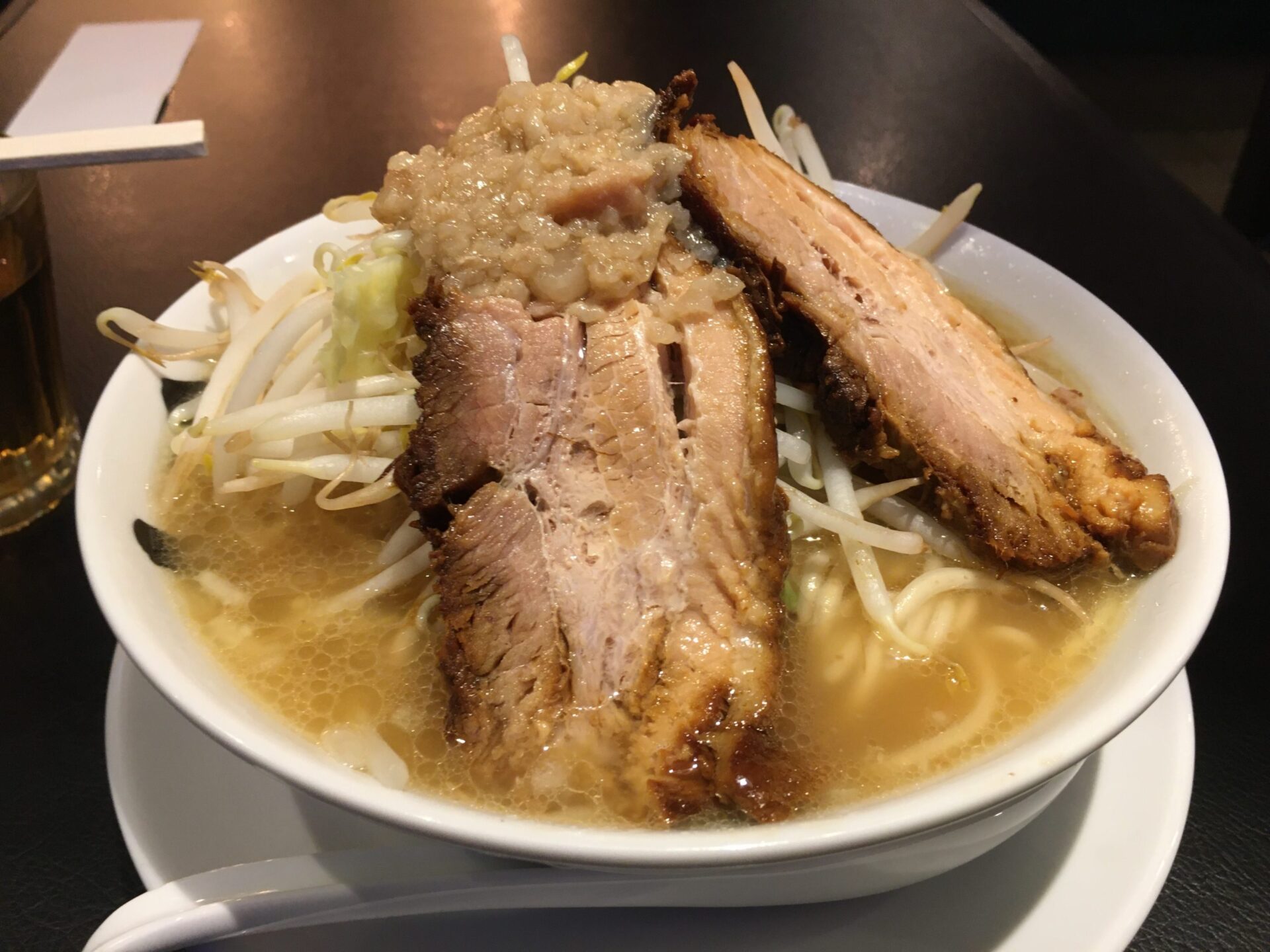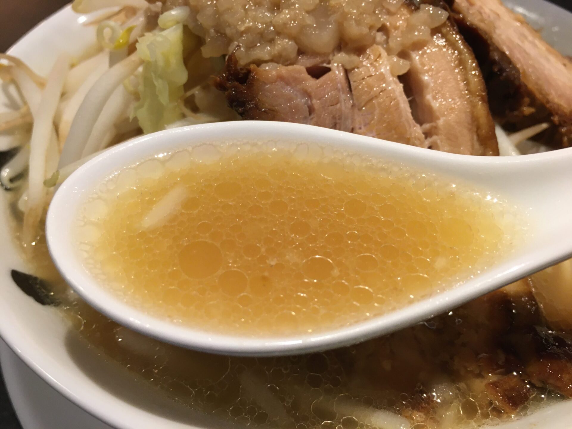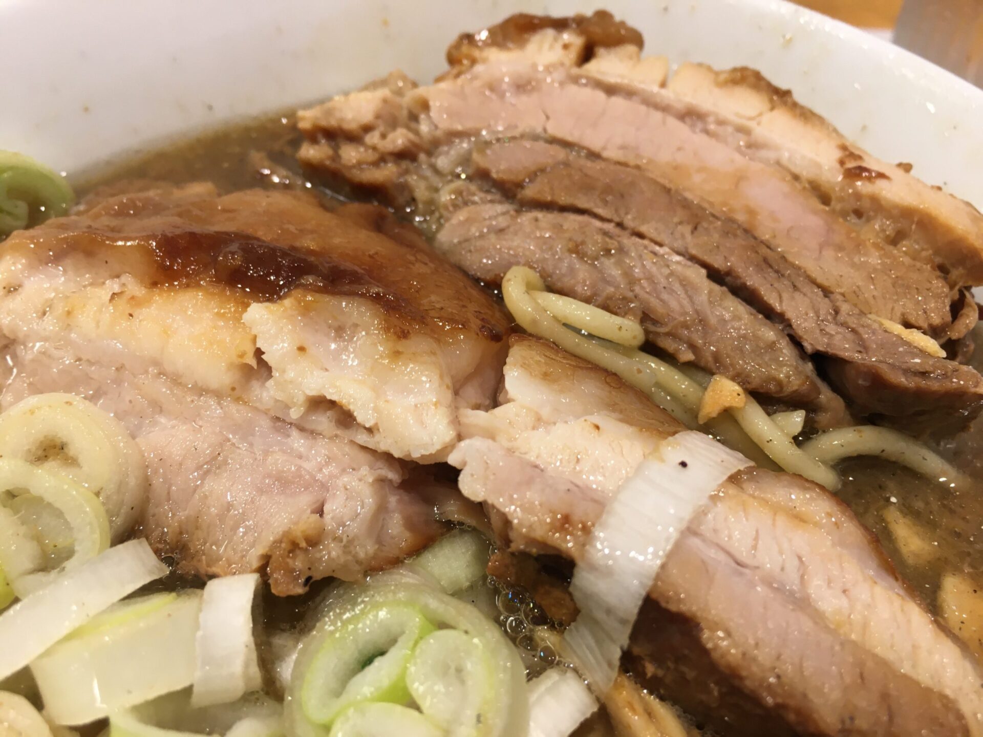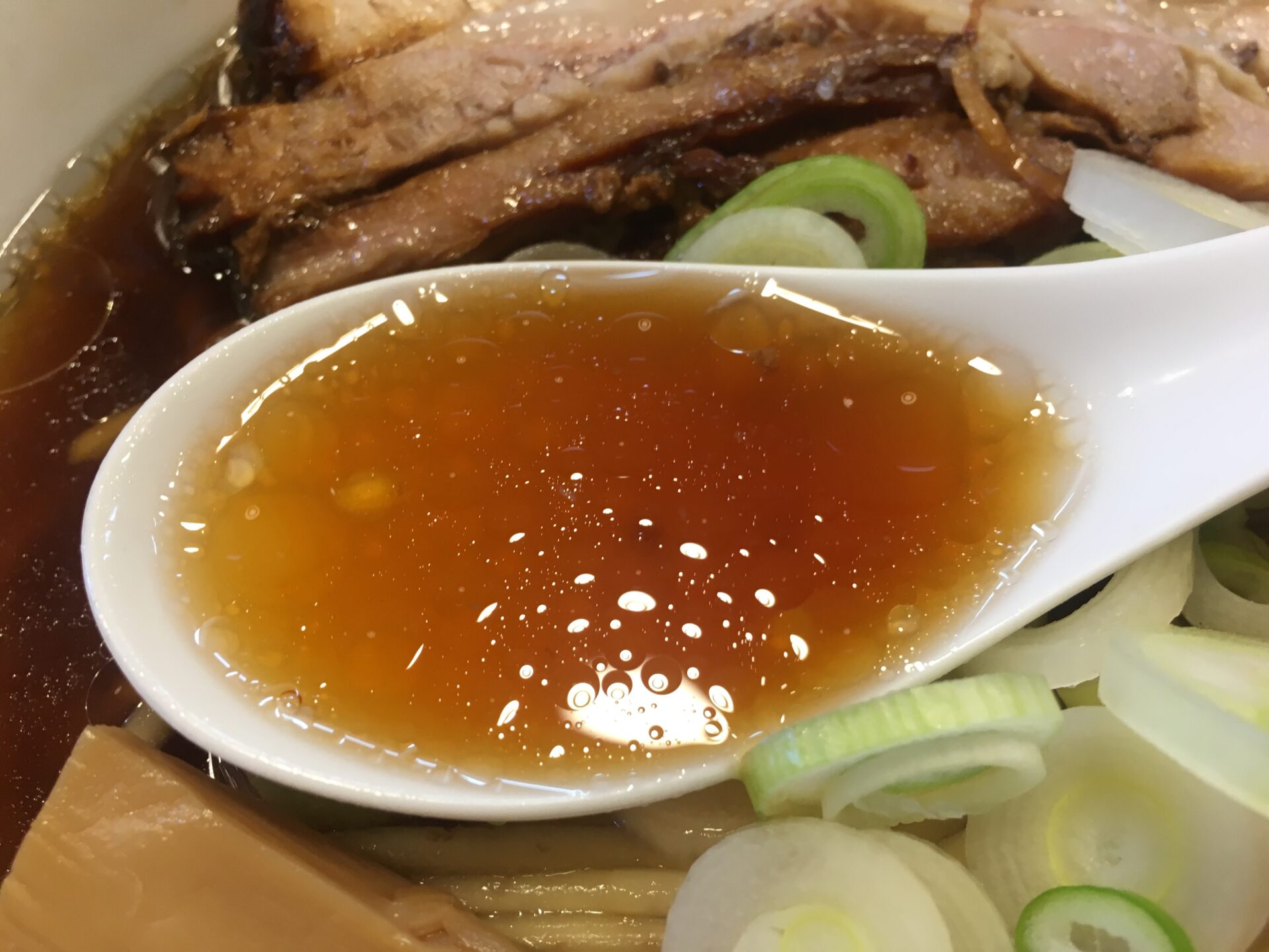 人気ナンバーワンメニュー。薄口醤油と貝の旨味が融合したスープは万人受けする味。口当たりがとても良い。初来店時にはこれを注文したい。澄んだスープの上に鎮座するのは角煮のような極厚チャーシュー。箸で切れるほどの柔らかさでジューシー。これを目当てに訪問する人も多いのだとか。麺は中太の全粒粉麺で少し固め。素人舌でもスープ、麺、トッピングが足し算ではなく完璧なバランスで一体化のが分かる。完成度が極端に高いラーメン。