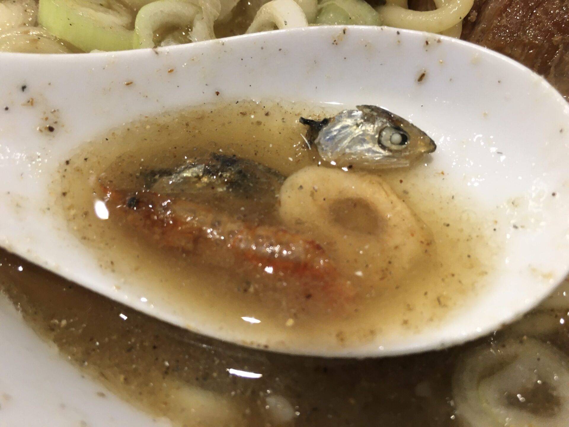 リニューアル後は煮干しベースの「らーめん骨」が新メニューとして登場。店員さん曰く「スープをよく混ぜてから食べるのがおススメ」。スープ内には出汁のベースになっている稚魚も確認できる。