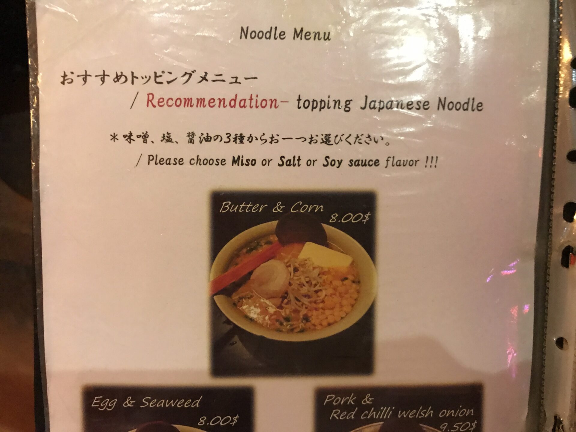 食べるべき一品:「味噌バターコーンラーメン」(8ドル)