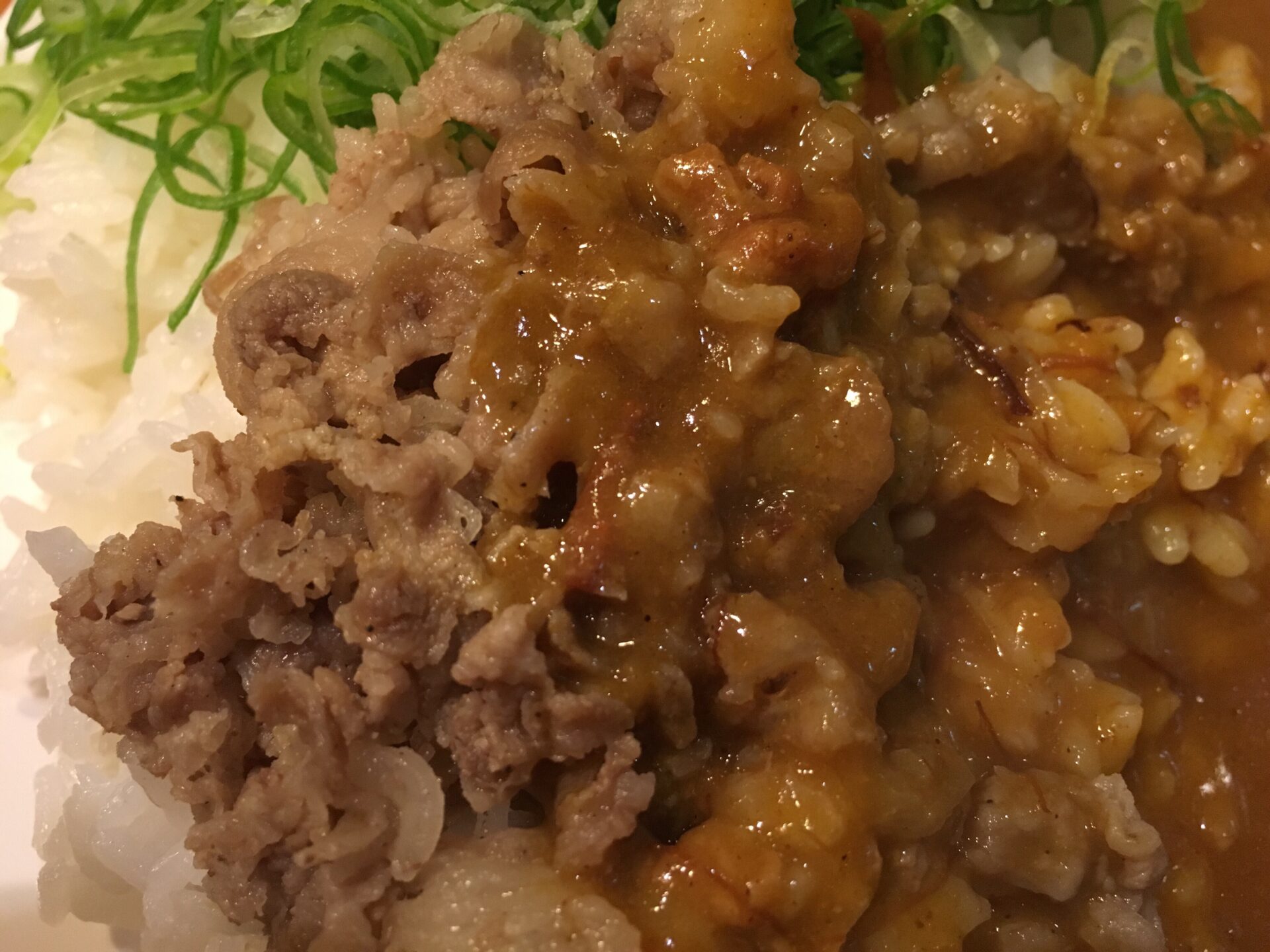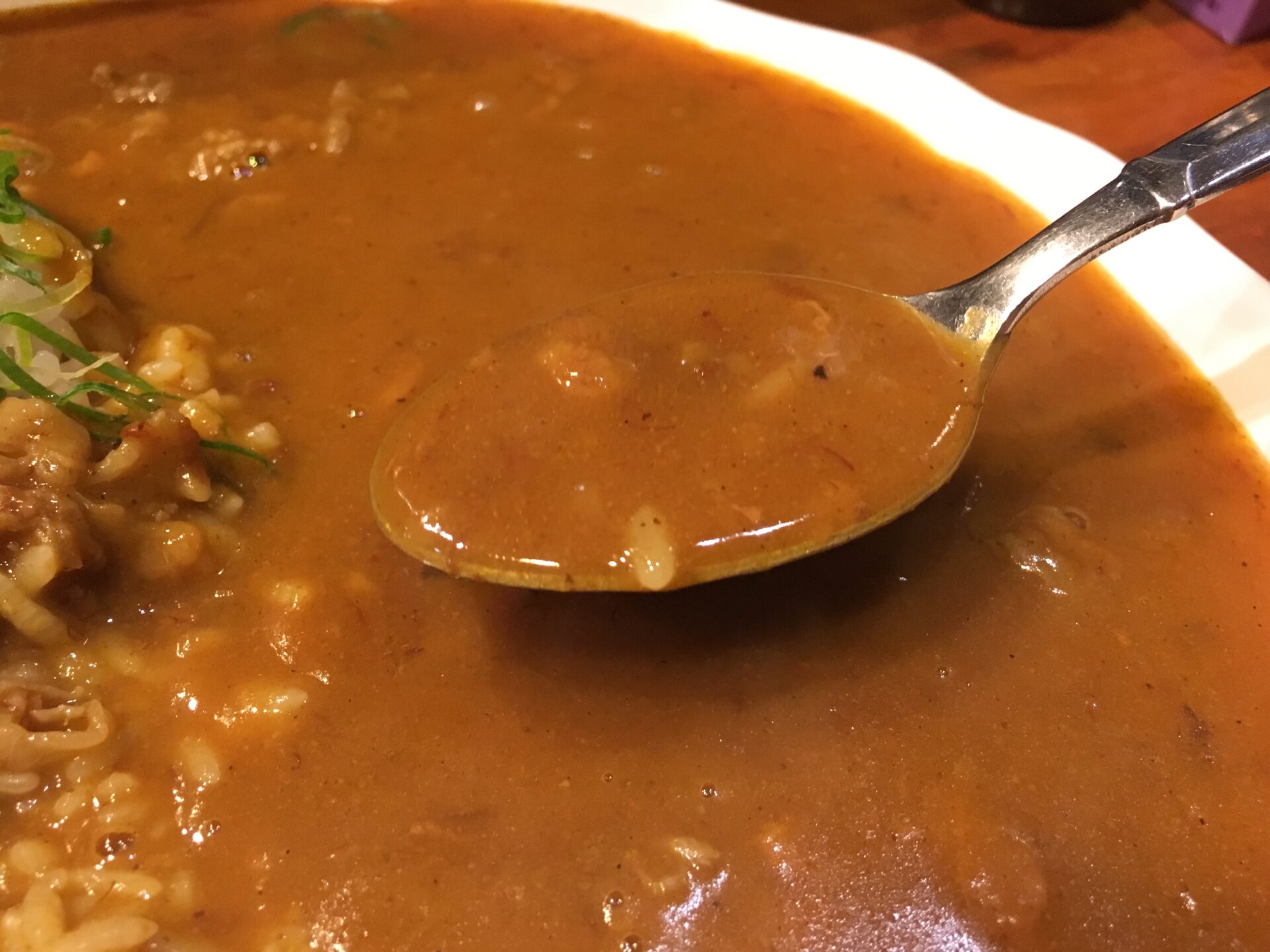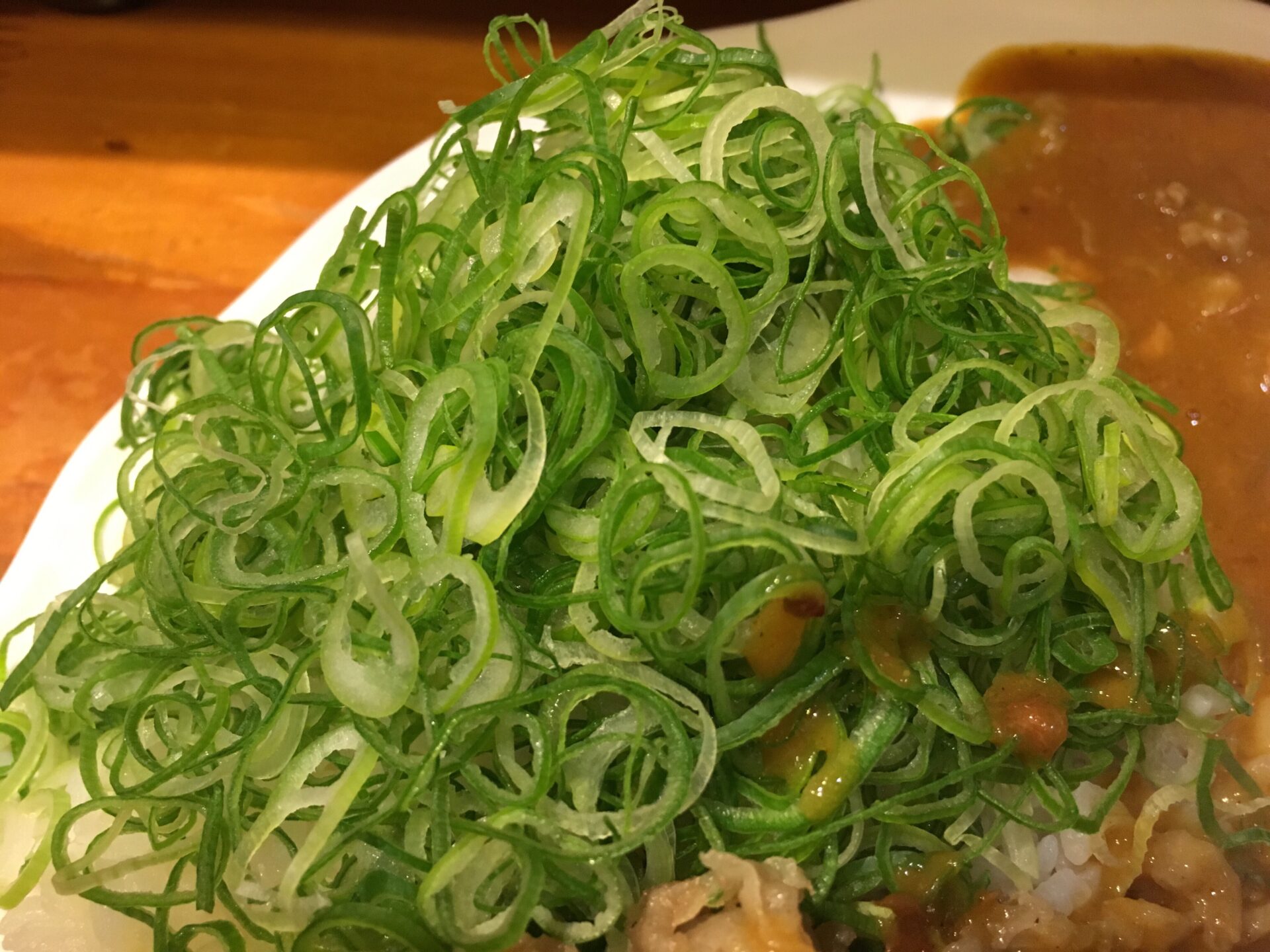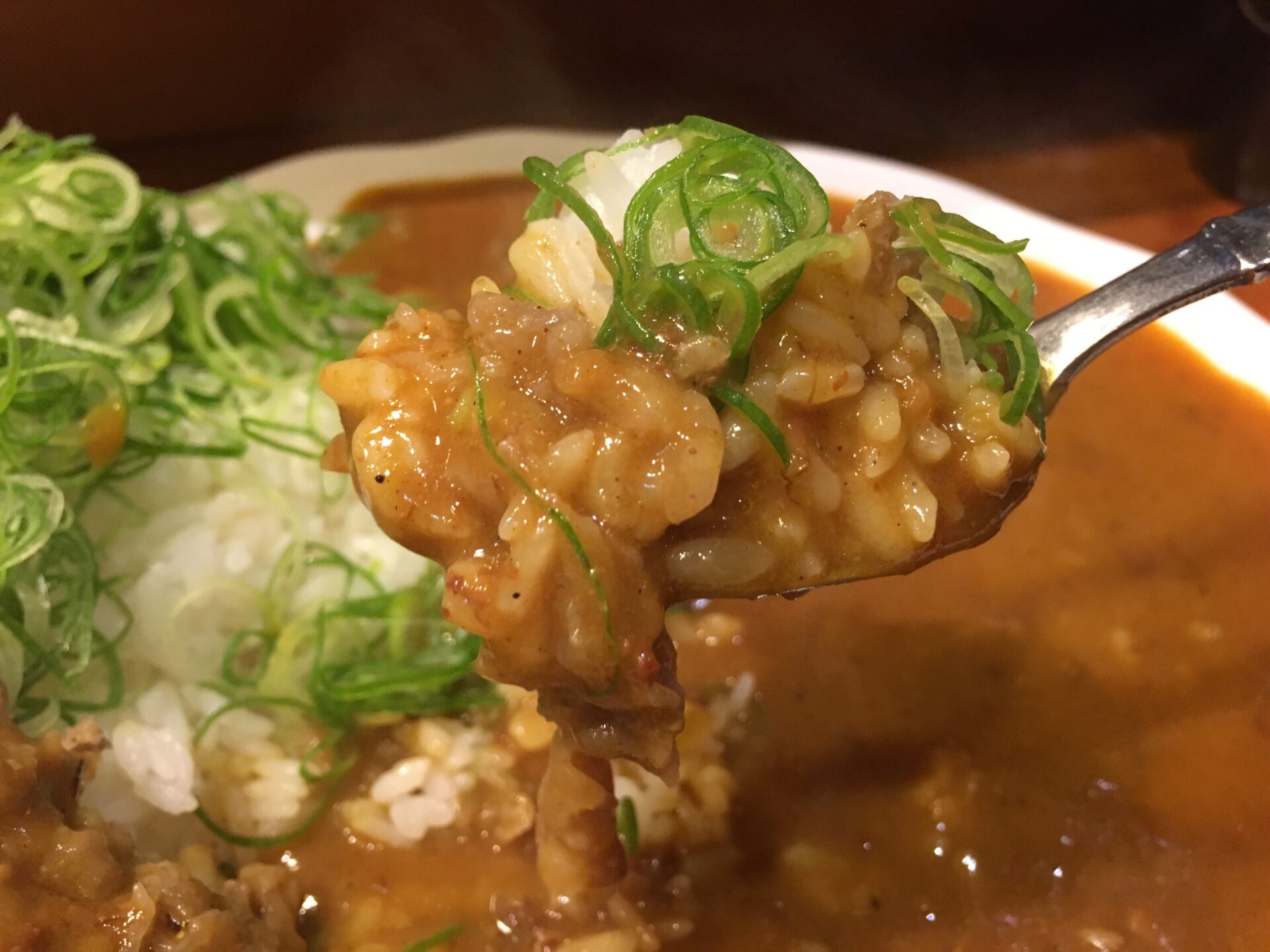 人気ナンバーワンメニュー。写真はライス大盛(+100円)&ルー大盛(+150円)をオプション追加。辛さが話題になりがちな店だが、フルーツや野菜に加え、スパイスを20種類調合しているというルーは奥深い甘みも魅力。シャキシャキ食感のネギと、ジューシーな牛肉のコンビネーションが支持される理由は一口食べれば分かる。個人的にはマイルドカレーの方が好きなので、次回訪問時は生卵やチーズのトッピングを注文する予定。