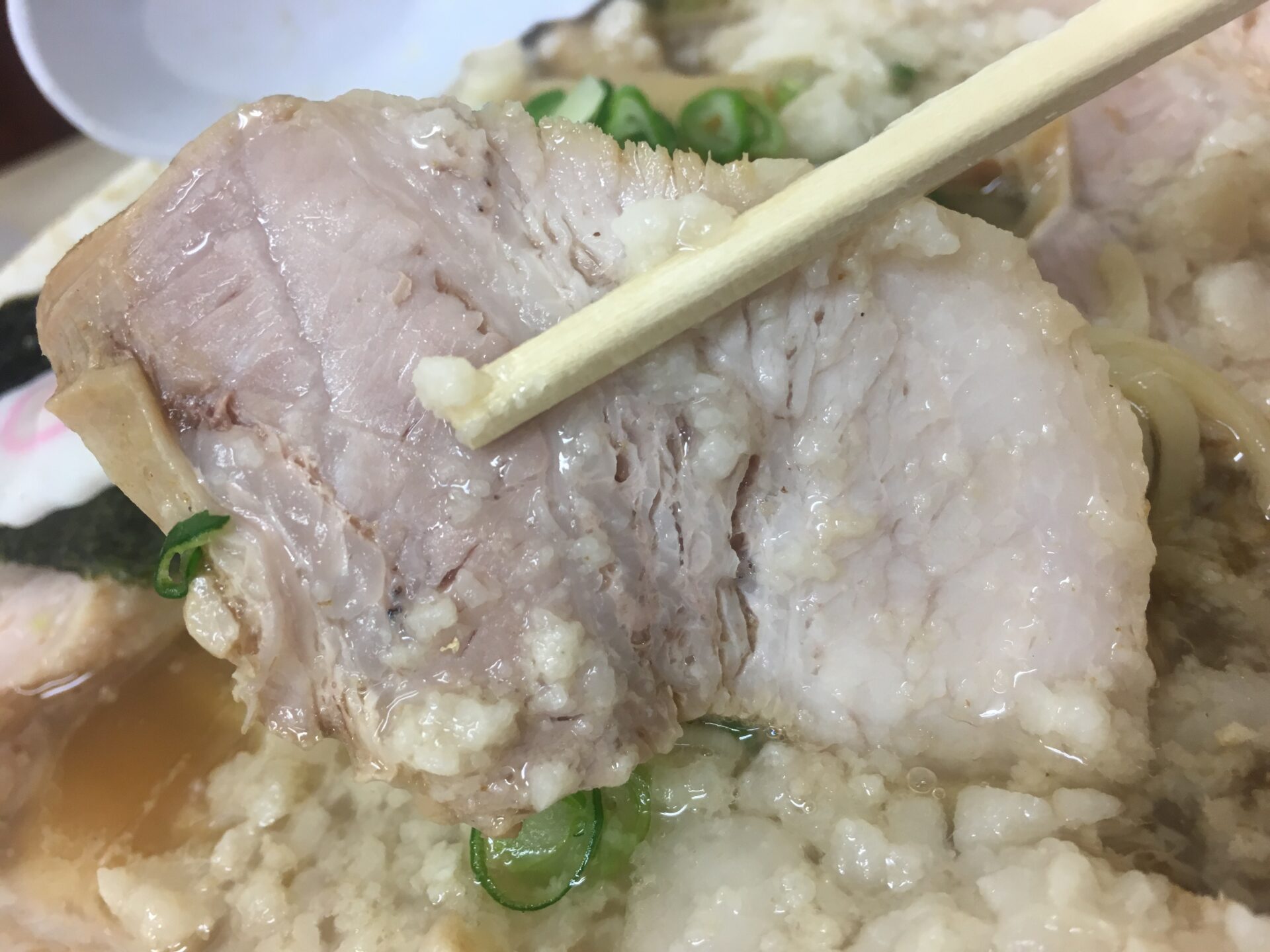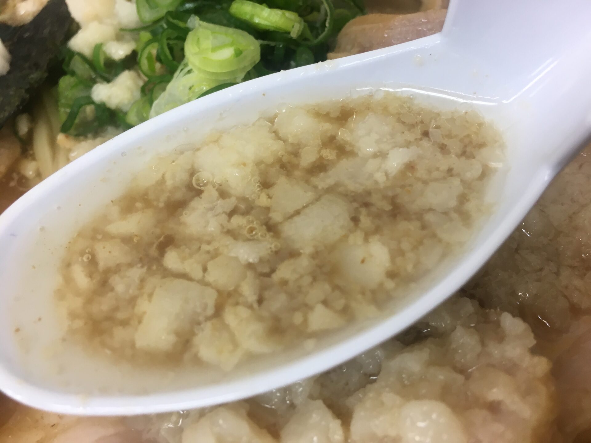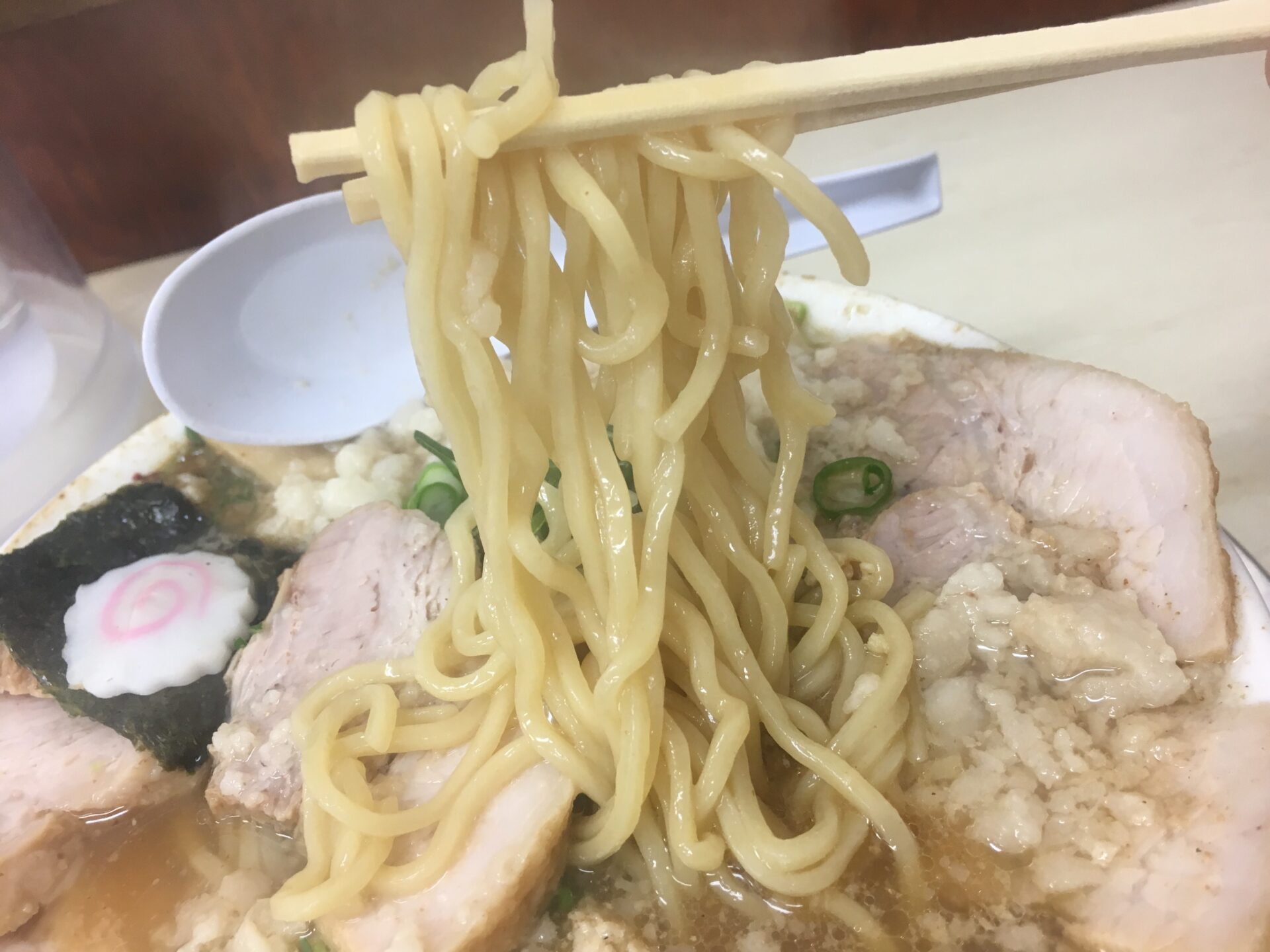 食欲をそそる背脂まみれのビジュアル。溢れんばかりのスープは寒い季節には身に染みる。背脂のおかげで食べ終わるまで熱々がキープされる。スープは鯵・鰯・ひらこなどの旨味が抜群。背脂は意外にあっさりで翌日の胃もたれの心配はなし。麺は北海道小麦「春よ恋」を使用。