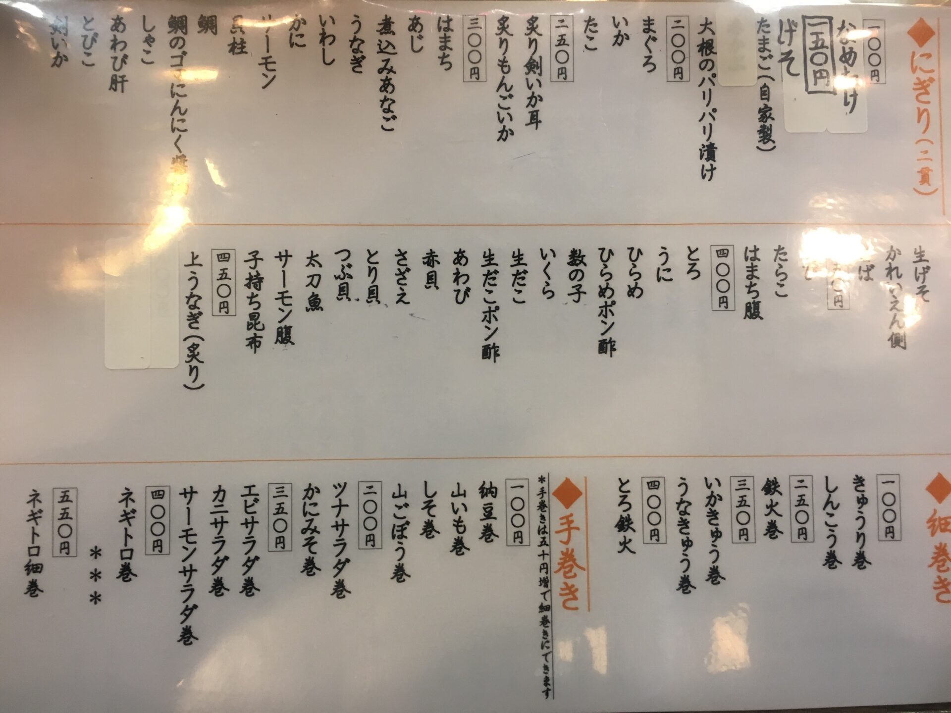 「〇〇腹」というネタが2つある。「サーモン」と「はまち」。「腹」は“脂がよくのっている部位”のことで、サーモン腹をトロサーモンと呼ぶ店もある。このサーモン腹は鮭1匹から数%しかとれない希少部位にも関わらず、春駒ではサーモンの+100円(400円)という良心価格で提供している。ハイカロリーなネタが好きな人間としては、口の中に入れた瞬間に溶け出す脂の旨味が最高。ネタも大きいので食べ応え抜群。