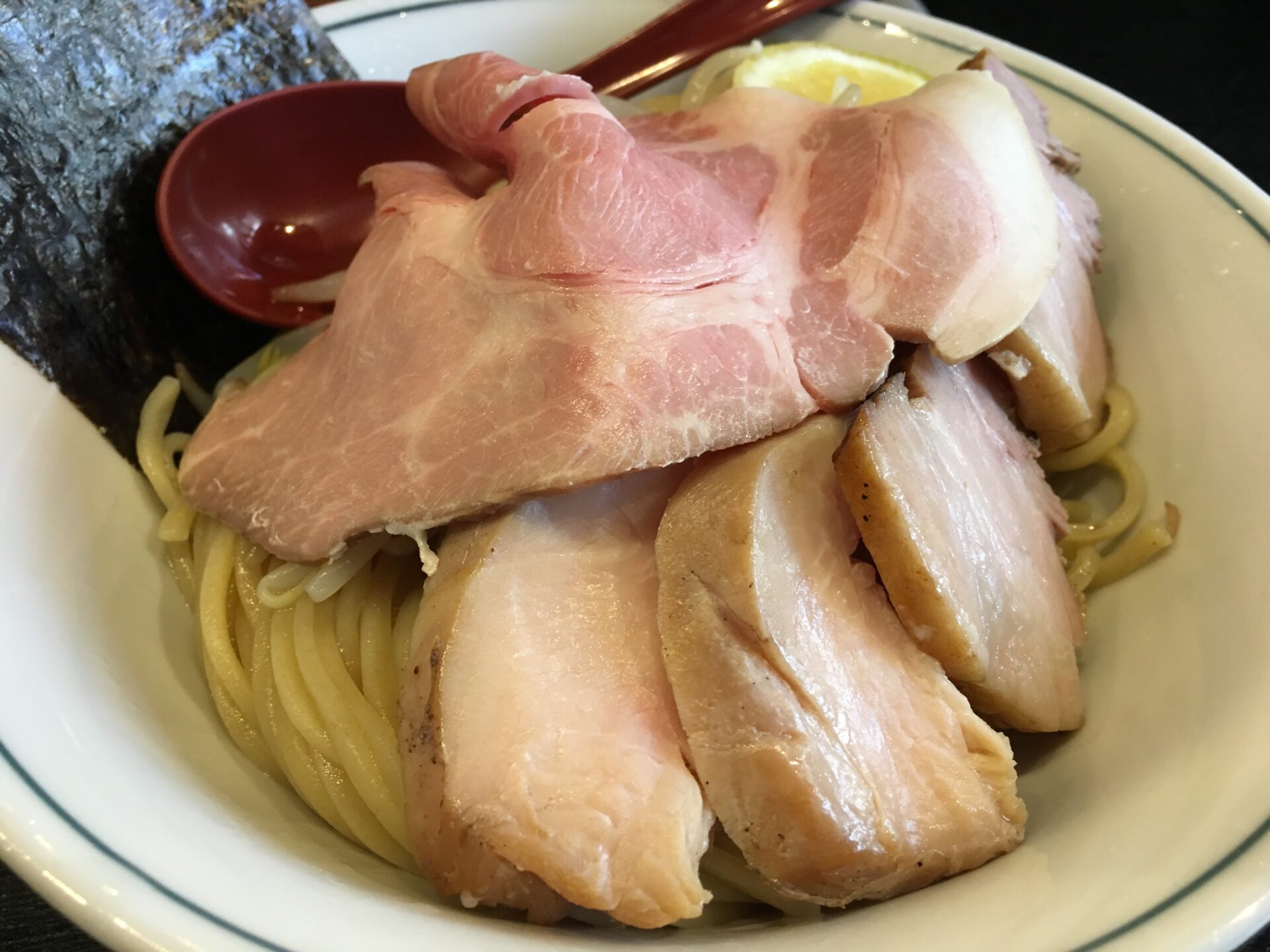 レアチャーシューが最高。「ほん田」にも共通するが、訪問理由の30%程度はラーメン店ながら肉を食べること。そのまま食べても美味しいが、つけ汁との相性が抜群なので、軽く潜らせるとさらに旨味ぱパワーアップ。