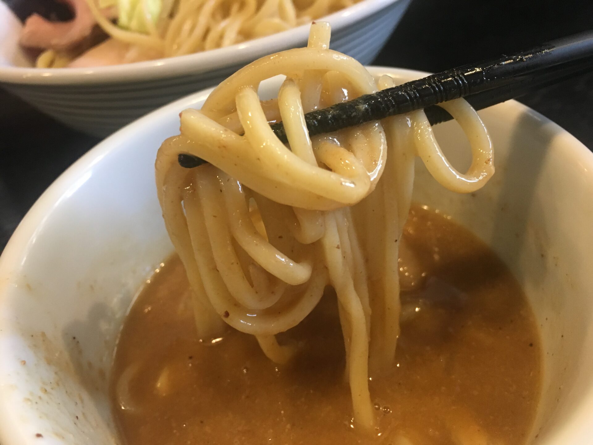 鶏白湯のスープは濃厚といいながら、脂っこさは感じない。魚介出汁で風味も豊か。麺は食べ馴染みのある「とみ田製麺所製」の中太麺。舌ざわりと喉越しが素晴らしいちゅるちゅるタイプ。ちゅるちゅる食感にも関わらず、しっかりスープが絡まるのだから不思議。