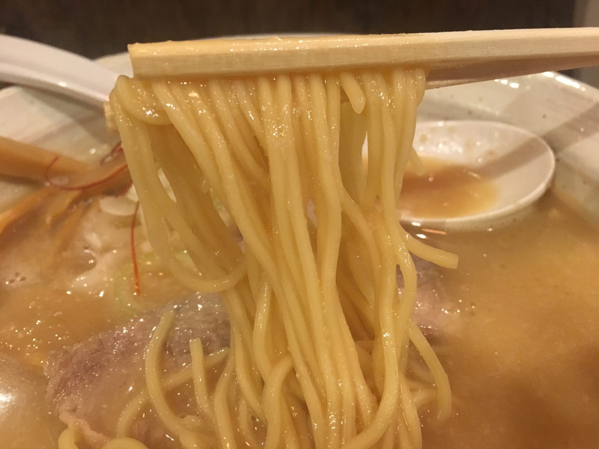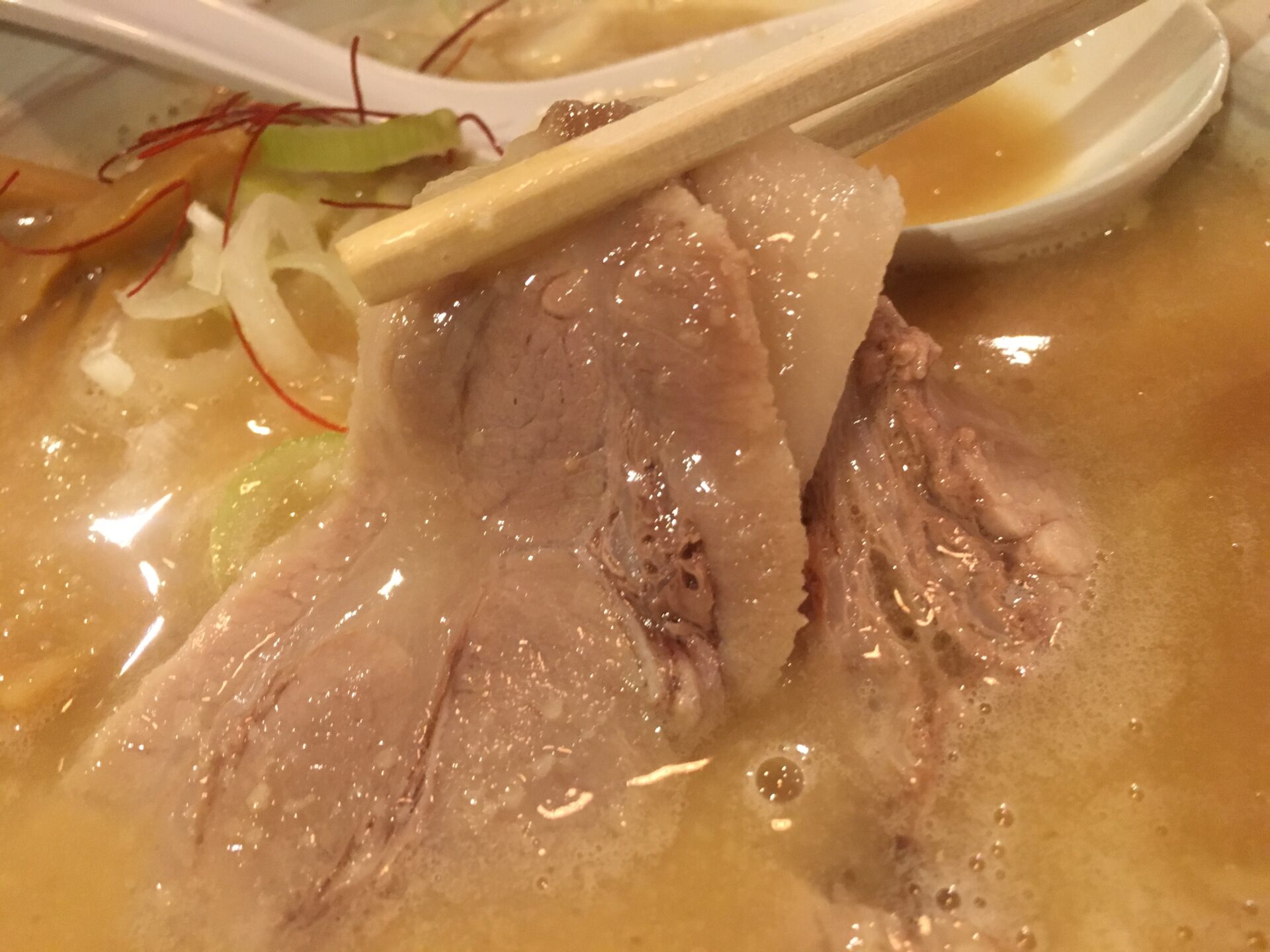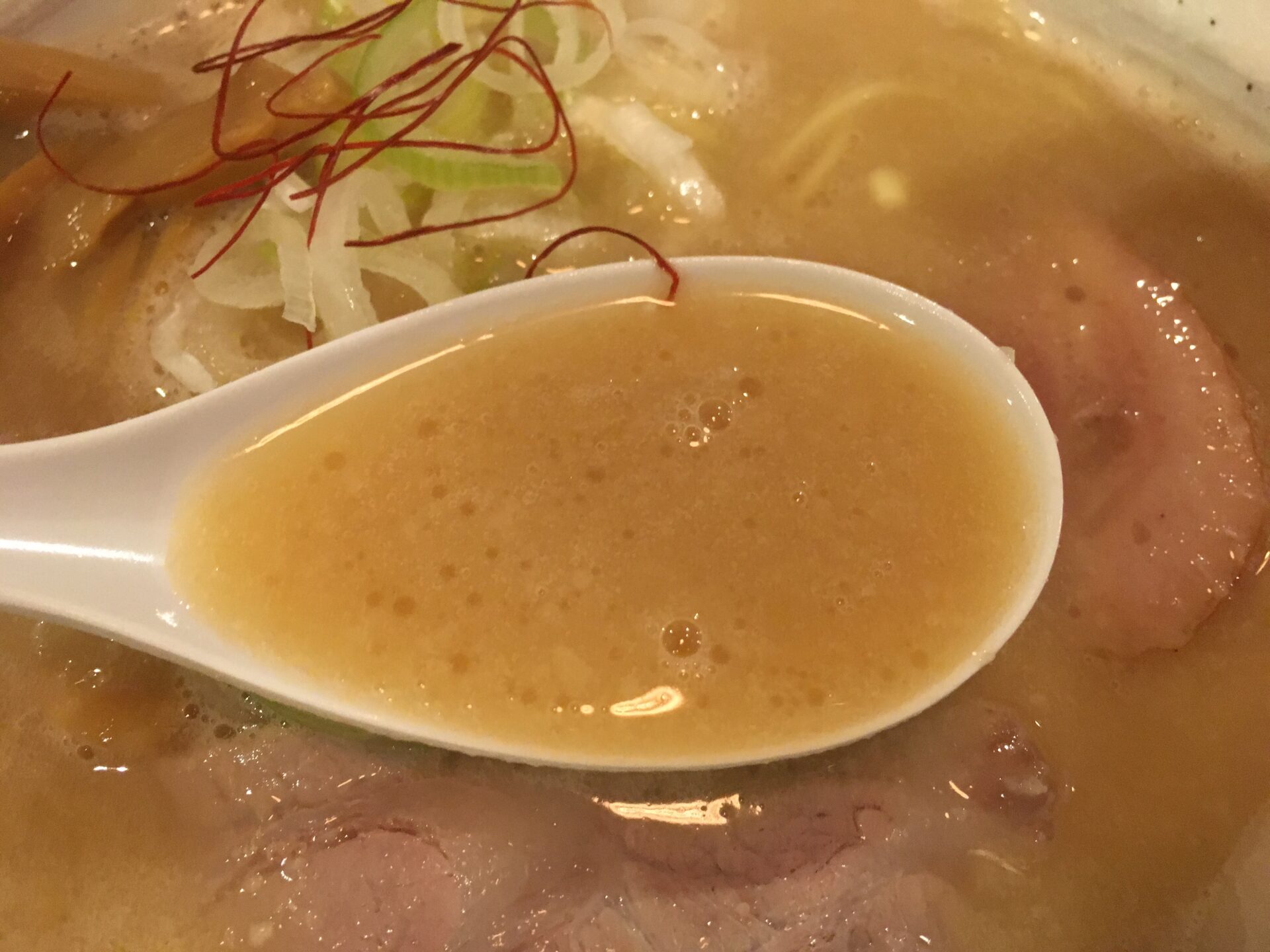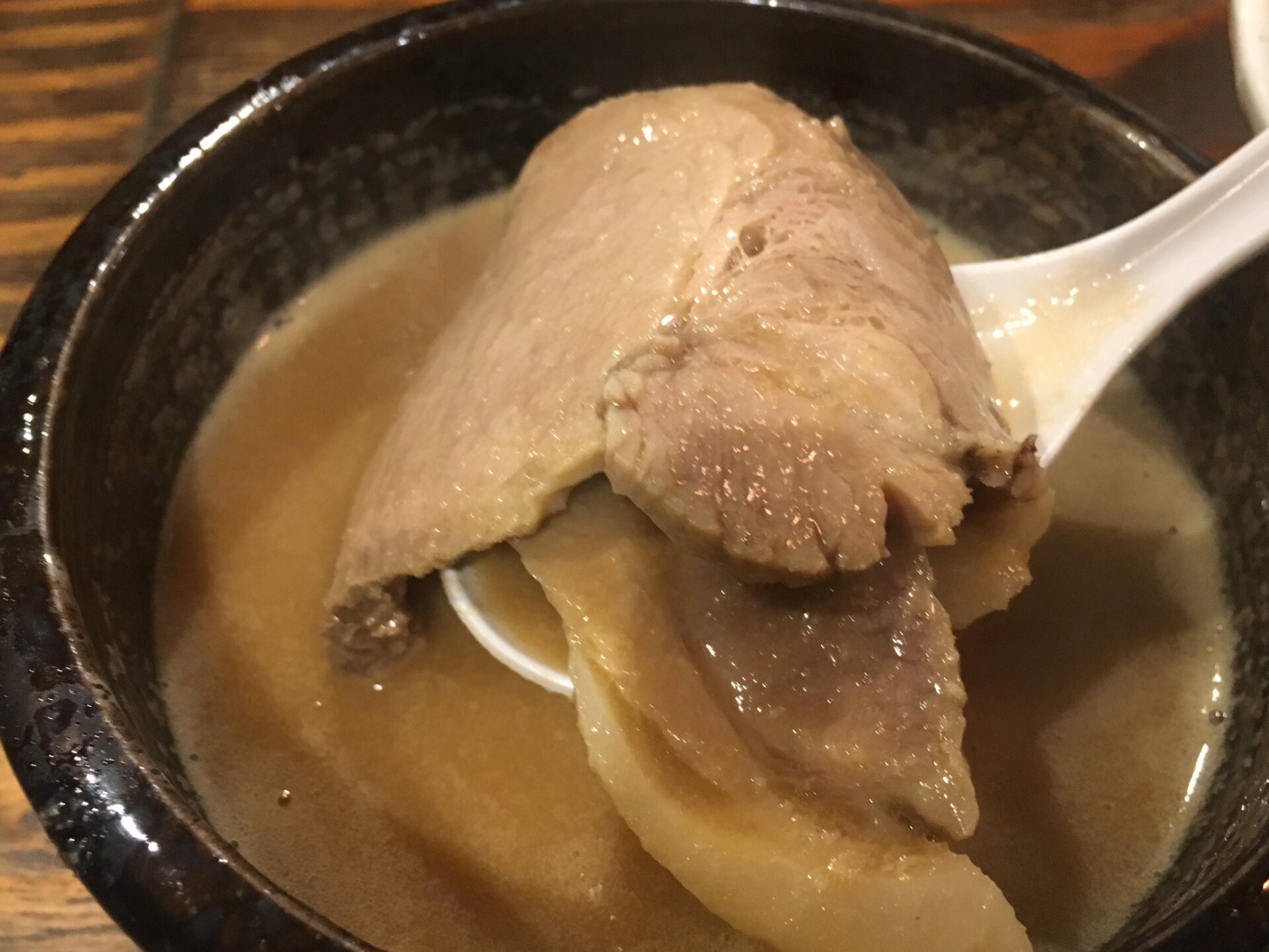 濃厚鶏白湯ラーメン。暖簾には「とんぴととり(豚皮と鶏)」の文字があり、豚皮が独特の脂感(旨味)をスープに与えている。店は“あっさりとこってりの間”を謳っているが、とろみもあるスープからはこってり寄りな味だと感じる。麺がスープによく絡み、替え玉用のスープを残すのは少し大変。天下一品が好きな人におススメ。お店も推奨するおろし生にんにくとの相性は最強。塩煮豚も美味い。