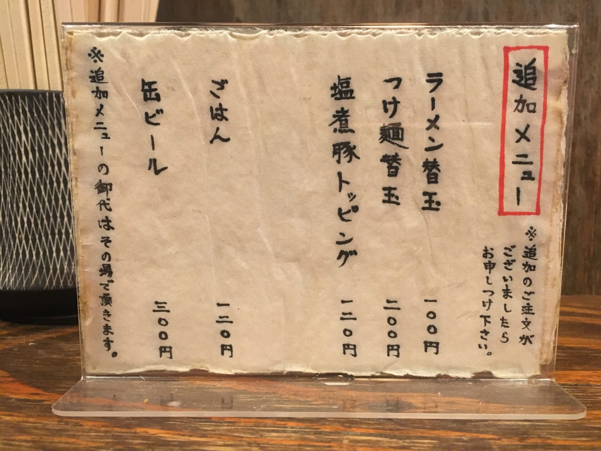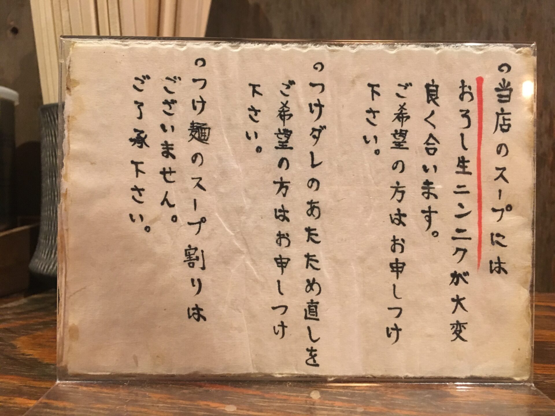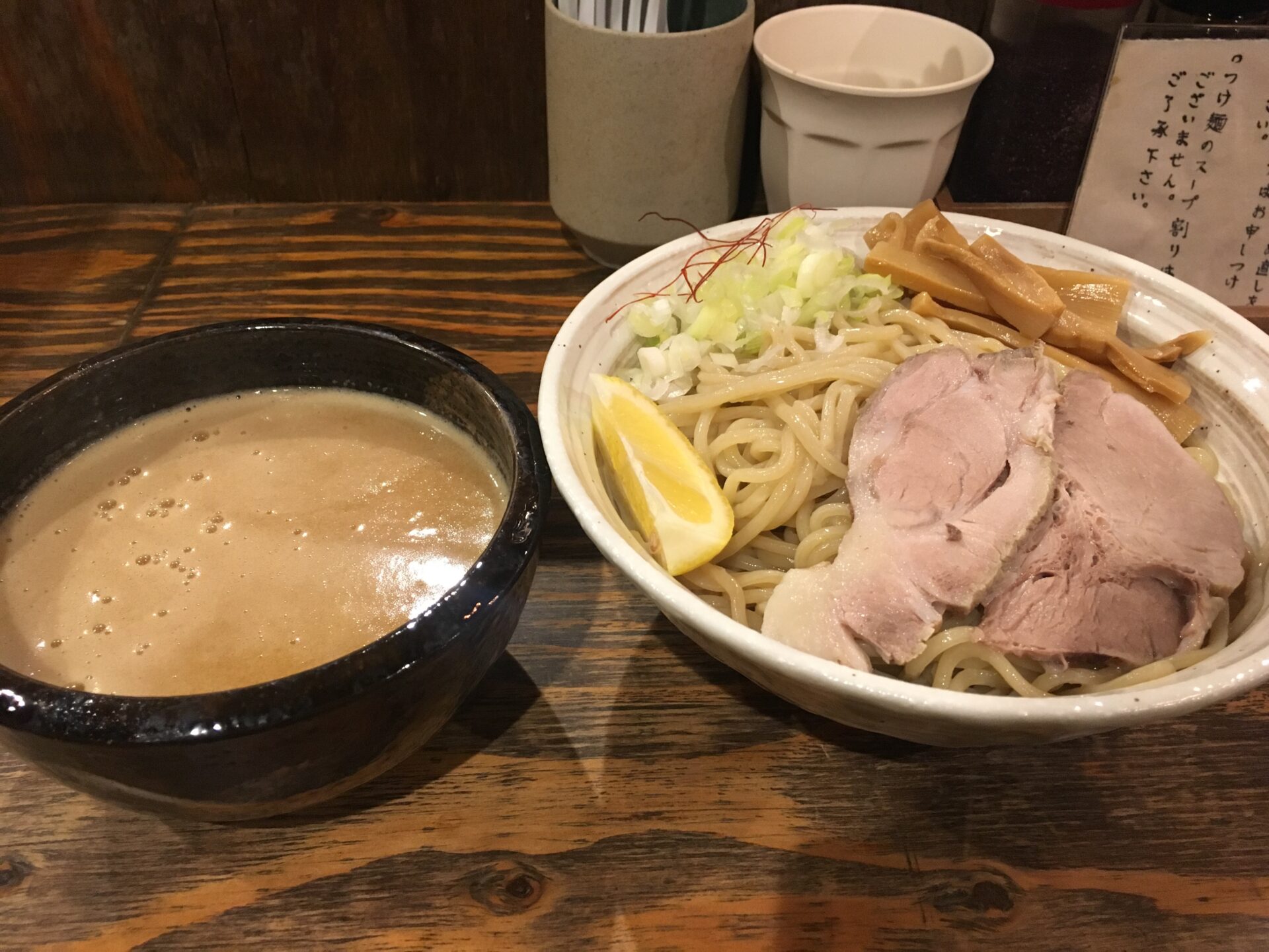 本店はJR桜ノ宮駅にあり、今回紹介するのは支店。息子さんが店主として営業している。店名の通り、場所は西中島南方駅が最寄り。ただ、新大阪駅からでも距離はさほど変わらず、徒歩5分程度。近所には「みつ星製麺所」があるが、そちも本店は福島駅が最寄りなので、大阪市内の人気ラーメン屋支店が集中しているエリアと言える。メニューは「ラーメン」「つけ麺」の2種類。店内は広く、木目調の内装は温かみもあって、落ち着いて食事ができる雰囲気。