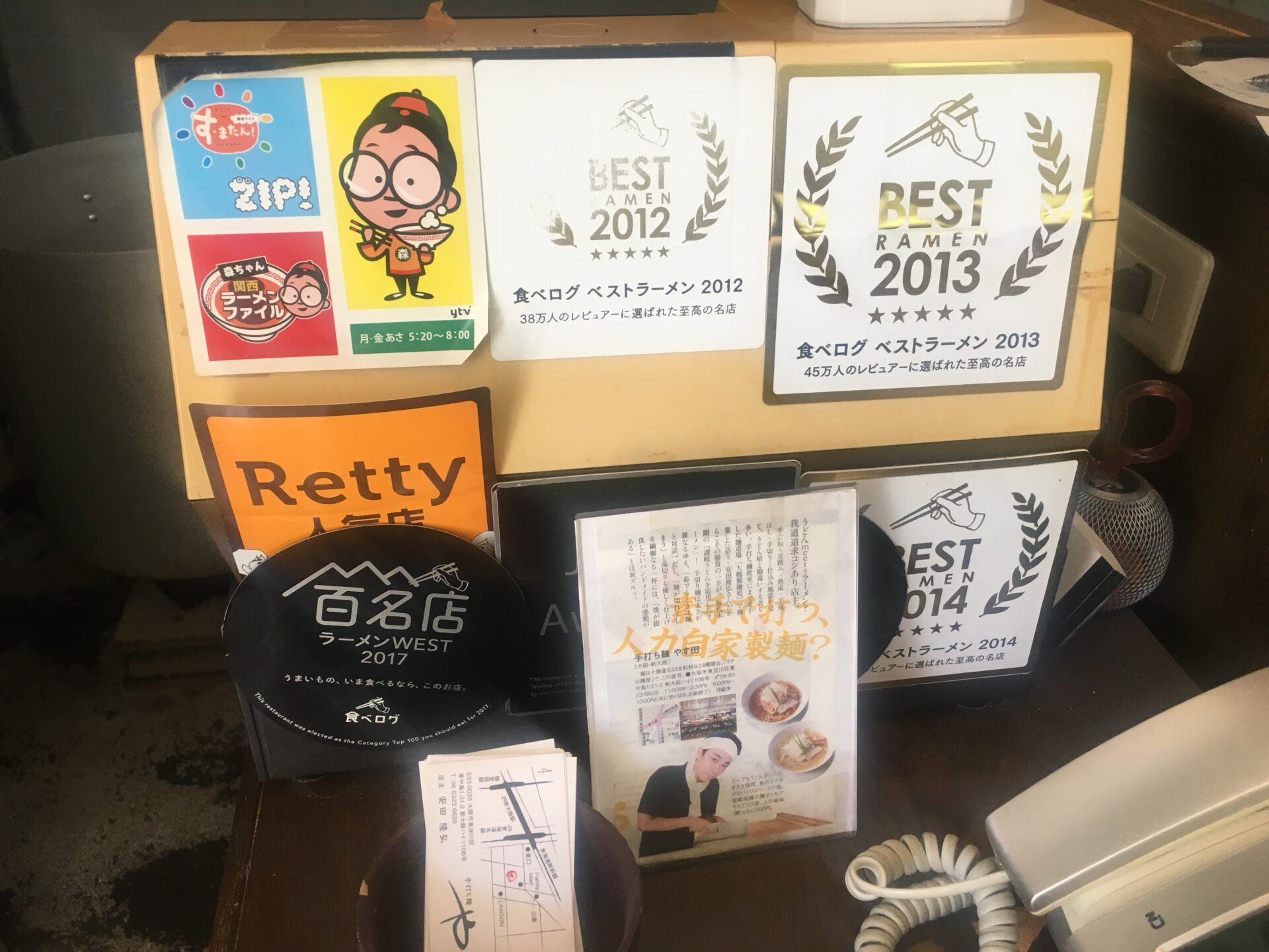新大阪駅東口(あまり利用しない方の出入口)から徒歩数分。昼のみの営業の人気店。驚きは店長のワンオペで営業されていること。メニューは「塩」「醤油」の2種類のラーメン。大盛は不可。飾り気のない外観も、店内に入れば所狭しと飾られた数々の表彰物から、ここが名店だとすぐ分かる。