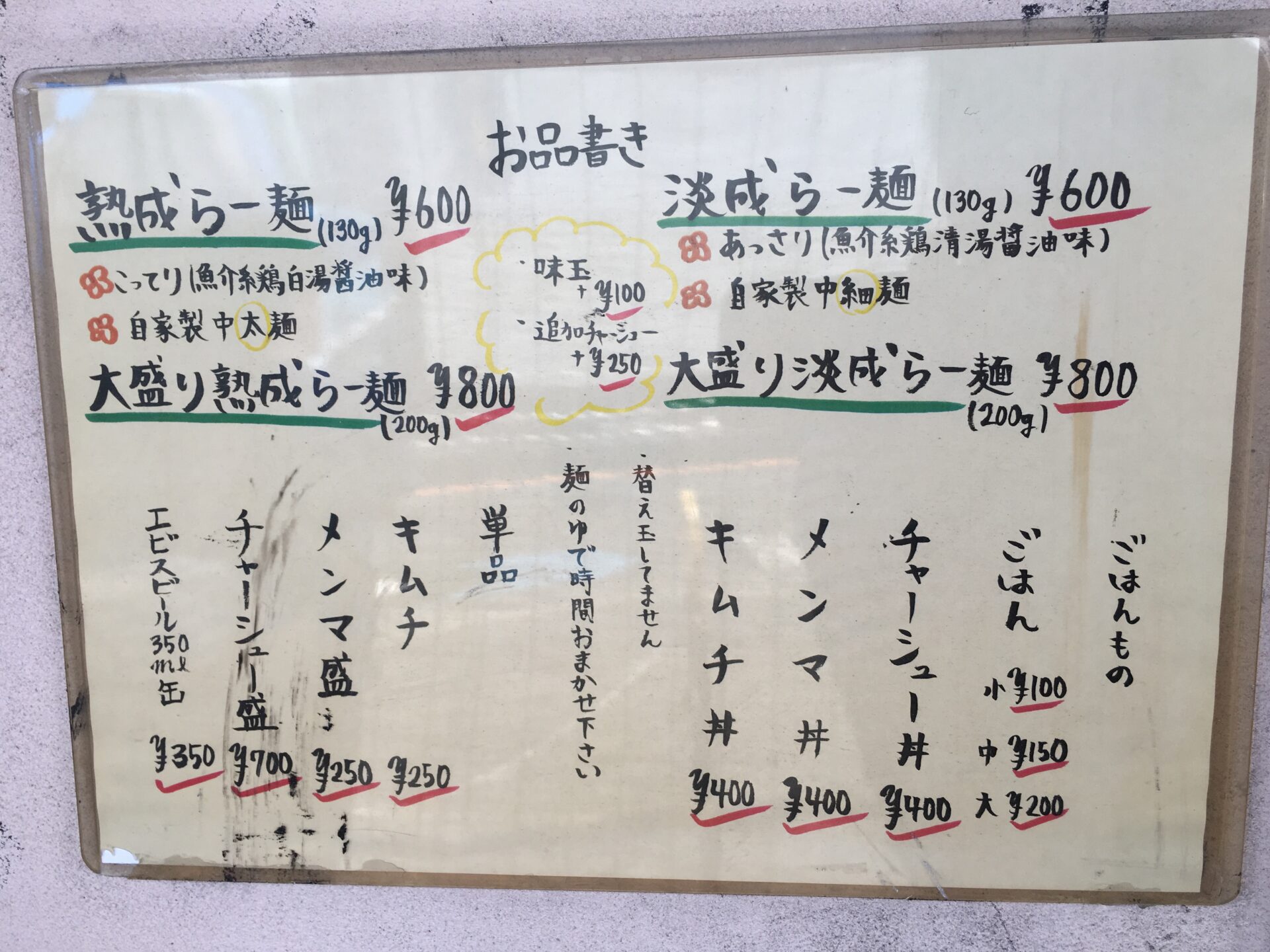 万博記念公園駅の隣駅である宇野辺駅から徒歩10分程度。府道14号(産業道路)沿いに店はあるが、駐車場はない。車訪問の場合は近所のコインパーキングを利用する(路駐に関しては店員が厳しく取り締まっている)。営業時間が短いこともあり、常に行列。平均1時間~1時間半程度の待ち時間が発生する。回転はかなり遅め。スープや丼もの完売のリスク回避の意味でも、早めの時間帯訪問が吉。店内はカウンターのみの9席。メニューは2種類+ご飯もの。こってり系の「熟成らーめん」と、あっさり系の「淡成らーめん」。熟成らーめんの方が完売が早い。