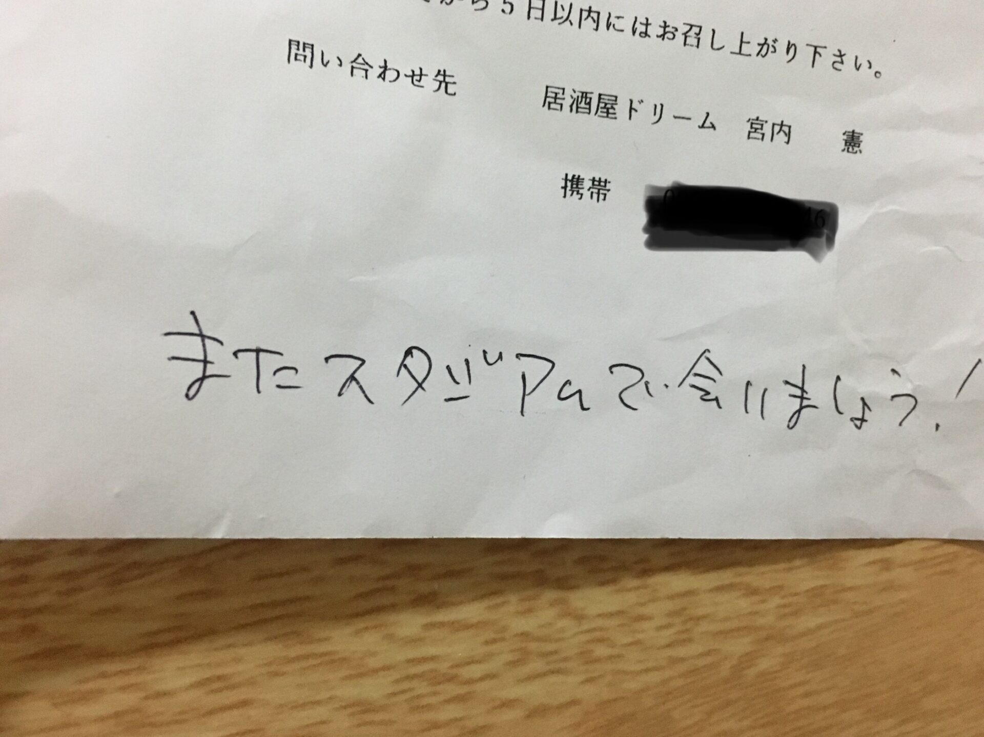 そして、店長の「またスタジアムで会いましょう!」と書かれた直筆メッセージが嬉しい。応援するつもりが逆に応援される。いつもそうだ。クラブにも、選手にも、スタグルにも、「サポーターだから応援するぞ!」と意気込んでスタジアムに行ったにもかかわらず、結果的に元気や勇気をもらっているのはいつも自分だ。