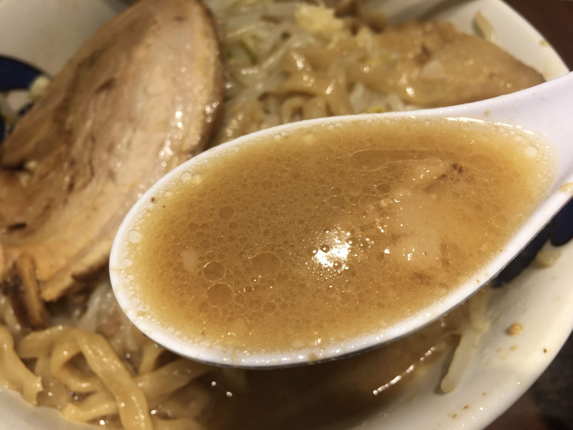 二郎系ラーメンはアブラ(脂)を楽しむ食べ物だと考えている。だから、スープでアブラが薄まらず、直接的にアブラと麺の味を楽しめる「汁無し」をおススメする。矛盾するようだが、そこに生卵を加えてマイルドに調整した味も美味しい。アブラのかかった大型バラロール(豚肉)に噛みついた後にワシワシな極太麺をすする。刻みニンニクの旨辛味のアクセントも最高。背徳感を感じるラーメンここに極まり。