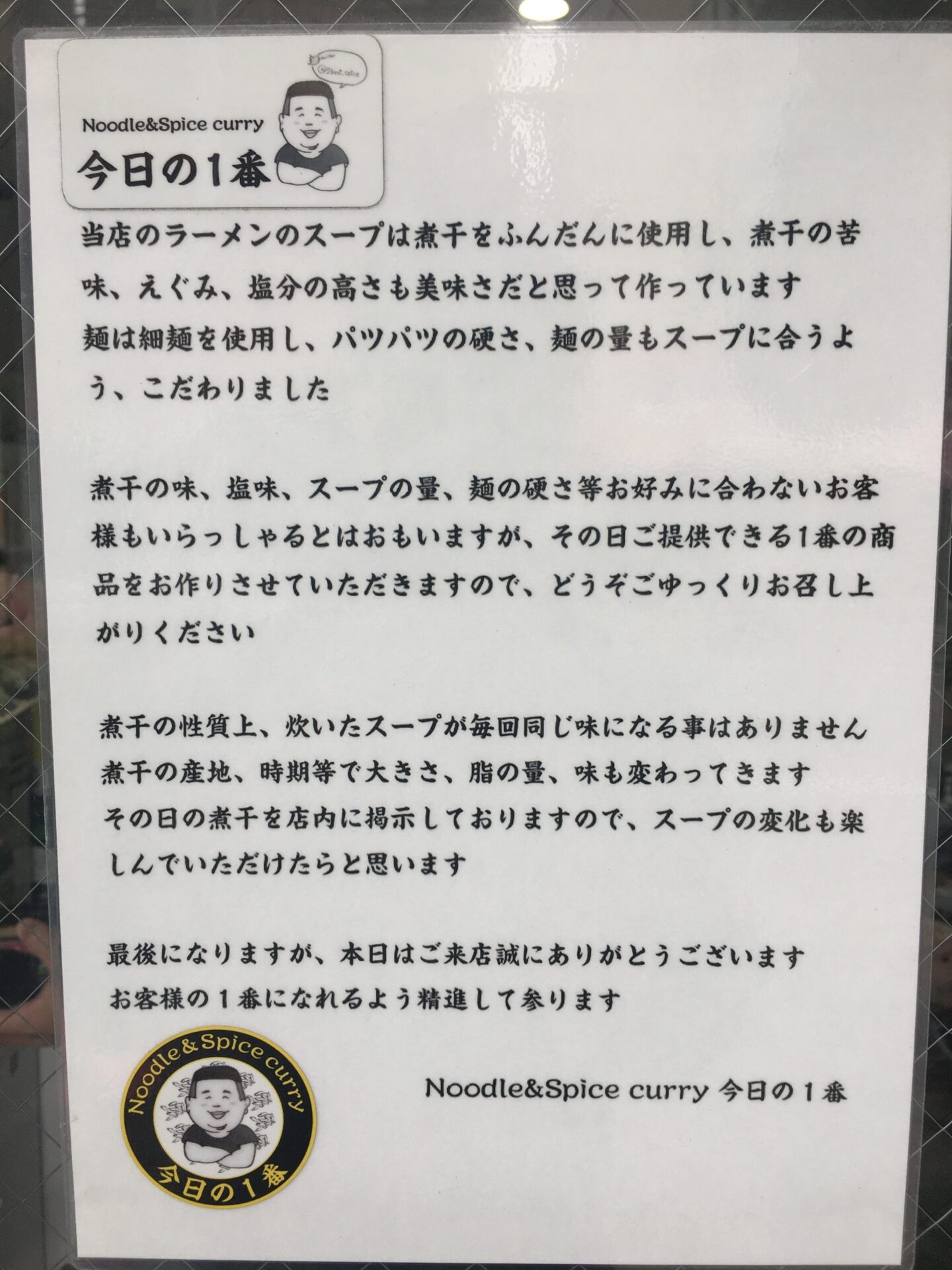店名:ヌードル&スパイスカレー 今日の1番 (Noodle&Spice curry 今日の1番)