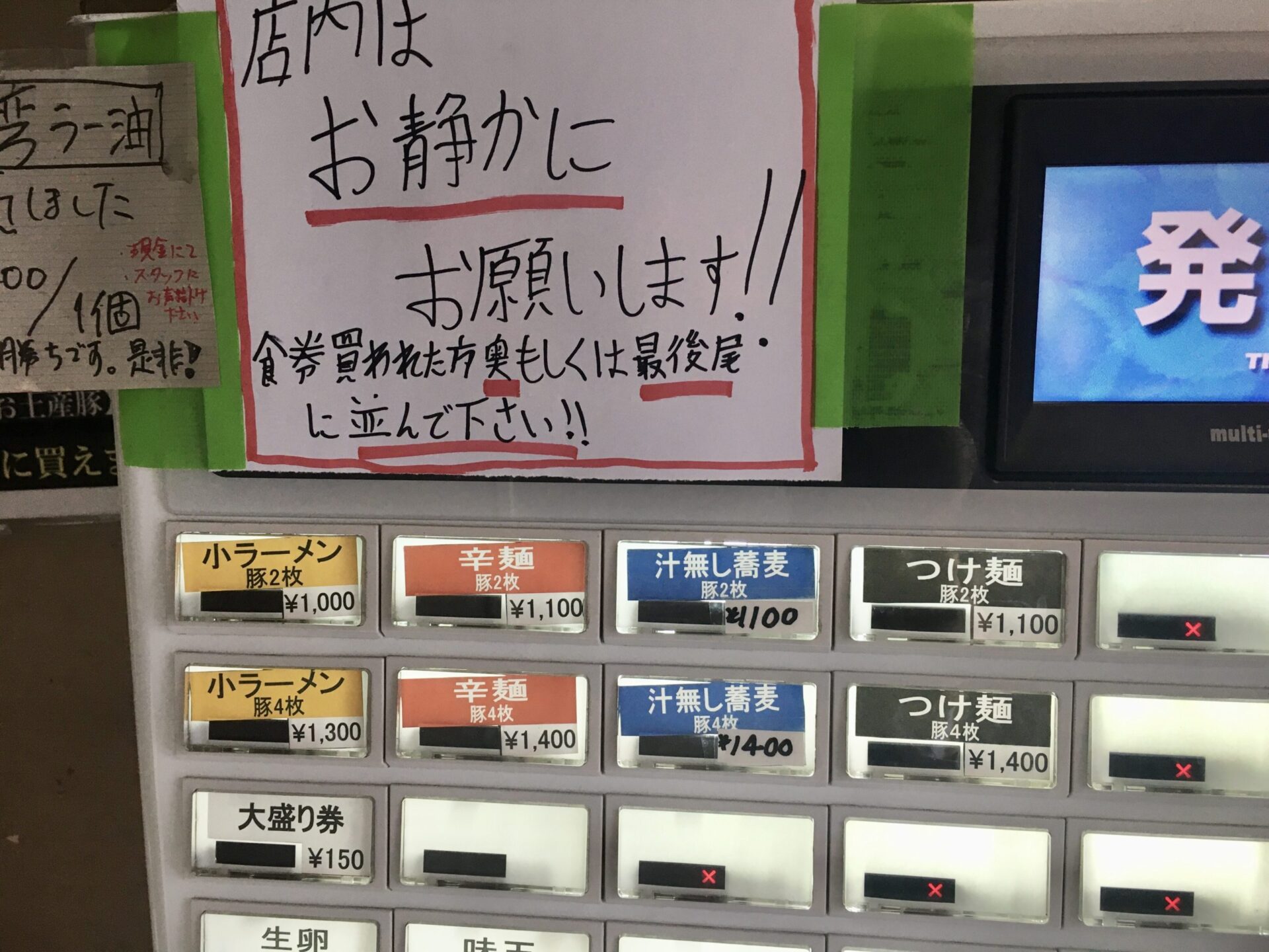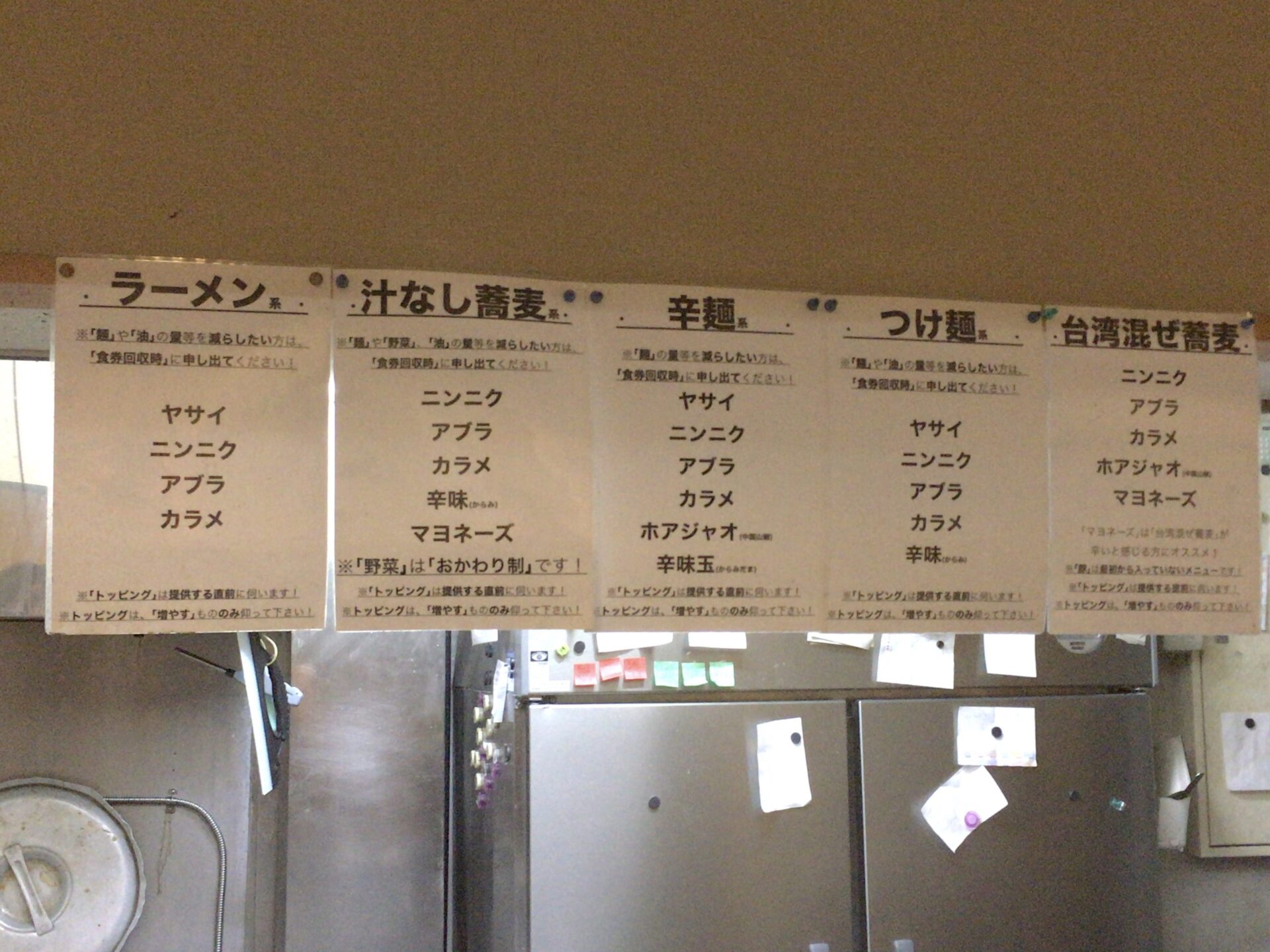 提供メニューはいわゆる二郎系。店内には商品別の無料トッピングメニュー(※写真参照)が貼られている。常連らしき人達はトッピングをシンプルにコールしている印象があり、マシマシはないのだろうと思っている。コールに対する店員からの返事はなく、全体的に殺伐とした雰囲気の店内。水(コップ)やれんげの確保方法などのローカルルールは周りの人の真似をして対応したい。